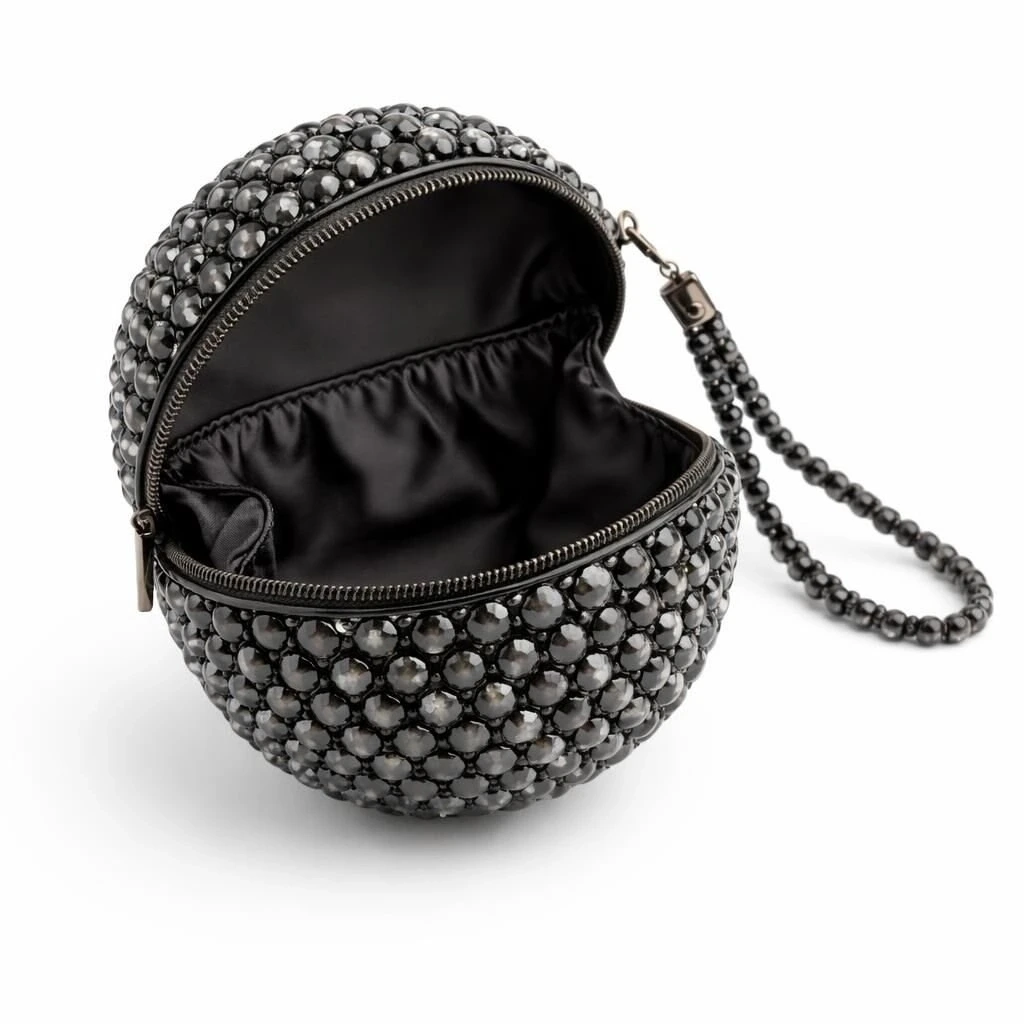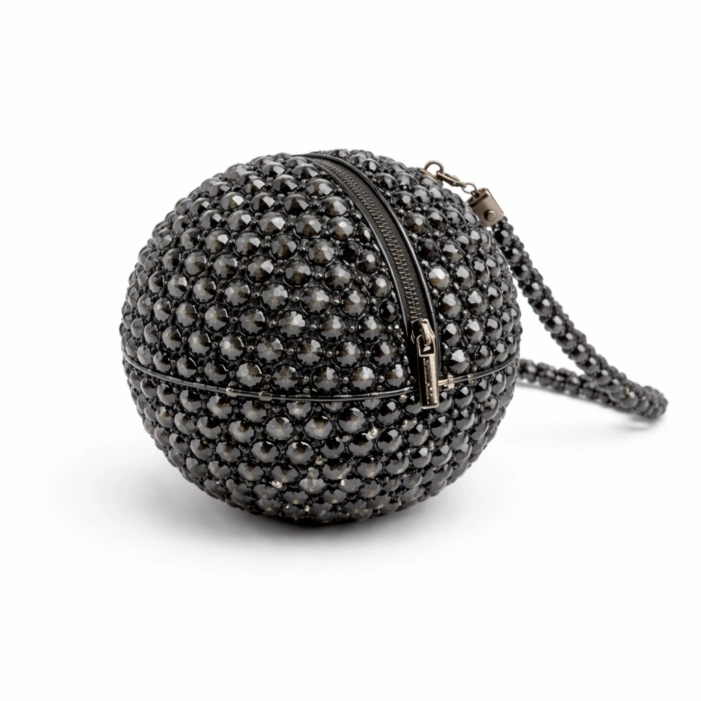 Modelin üst bölümünde yer alan metal fermuarlı kapatma sistemi, küresel yapıya entegre edilerek tasarlanmış; fermuar hattı, form bütünlüğünü bozmadan çantanın çevresini takip edecek şekilde konumlandırılmıştır. Fermuar çekme ucu ve metal aksesuarlar, kristal dokuyla kontrast oluşturmadan, dengeli bir parlaklık sunar.