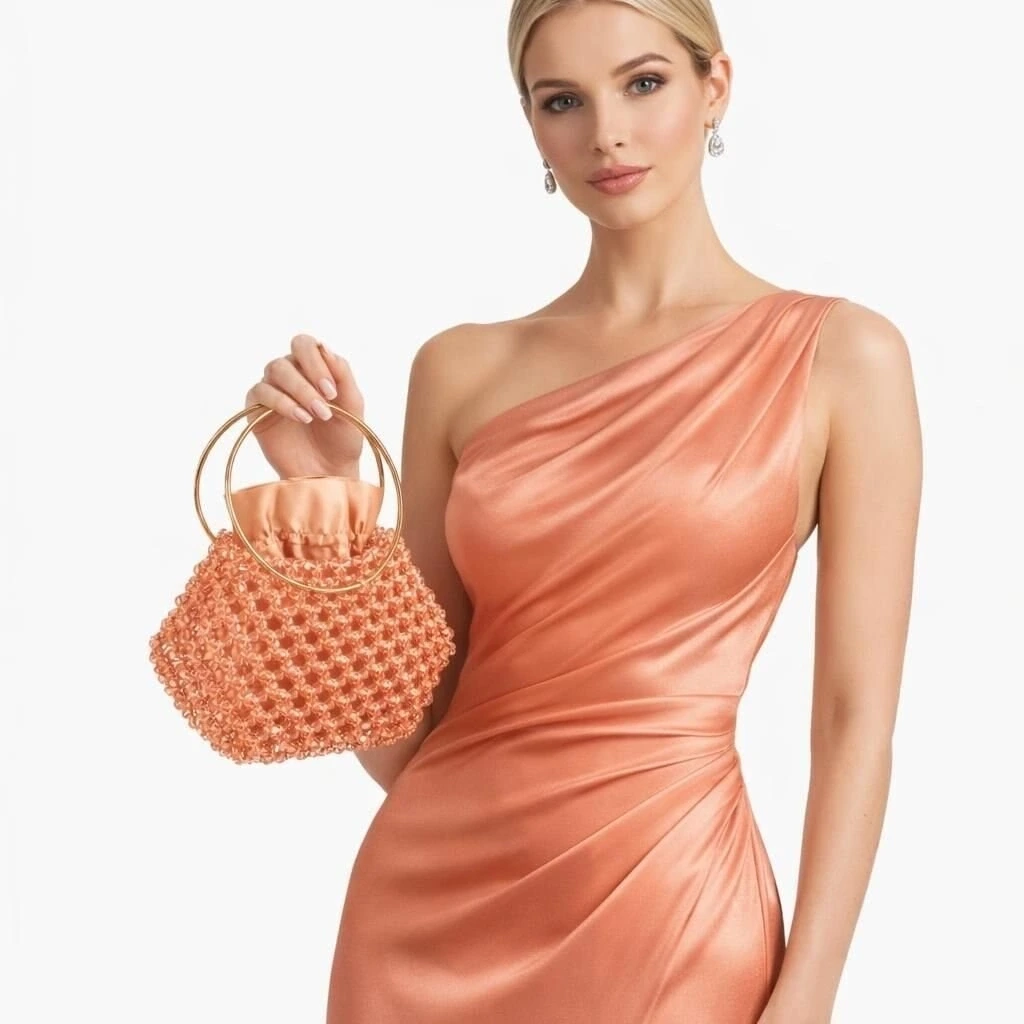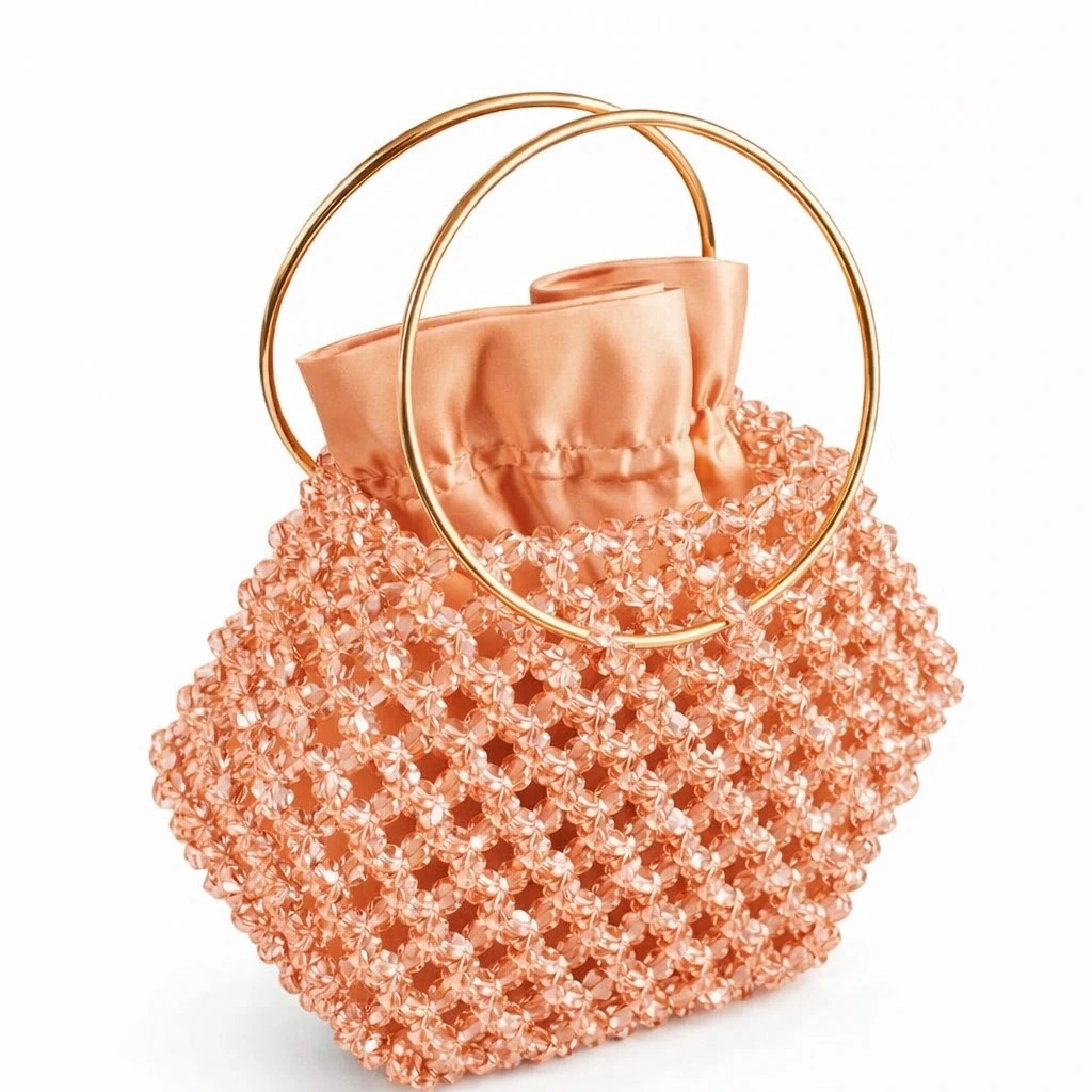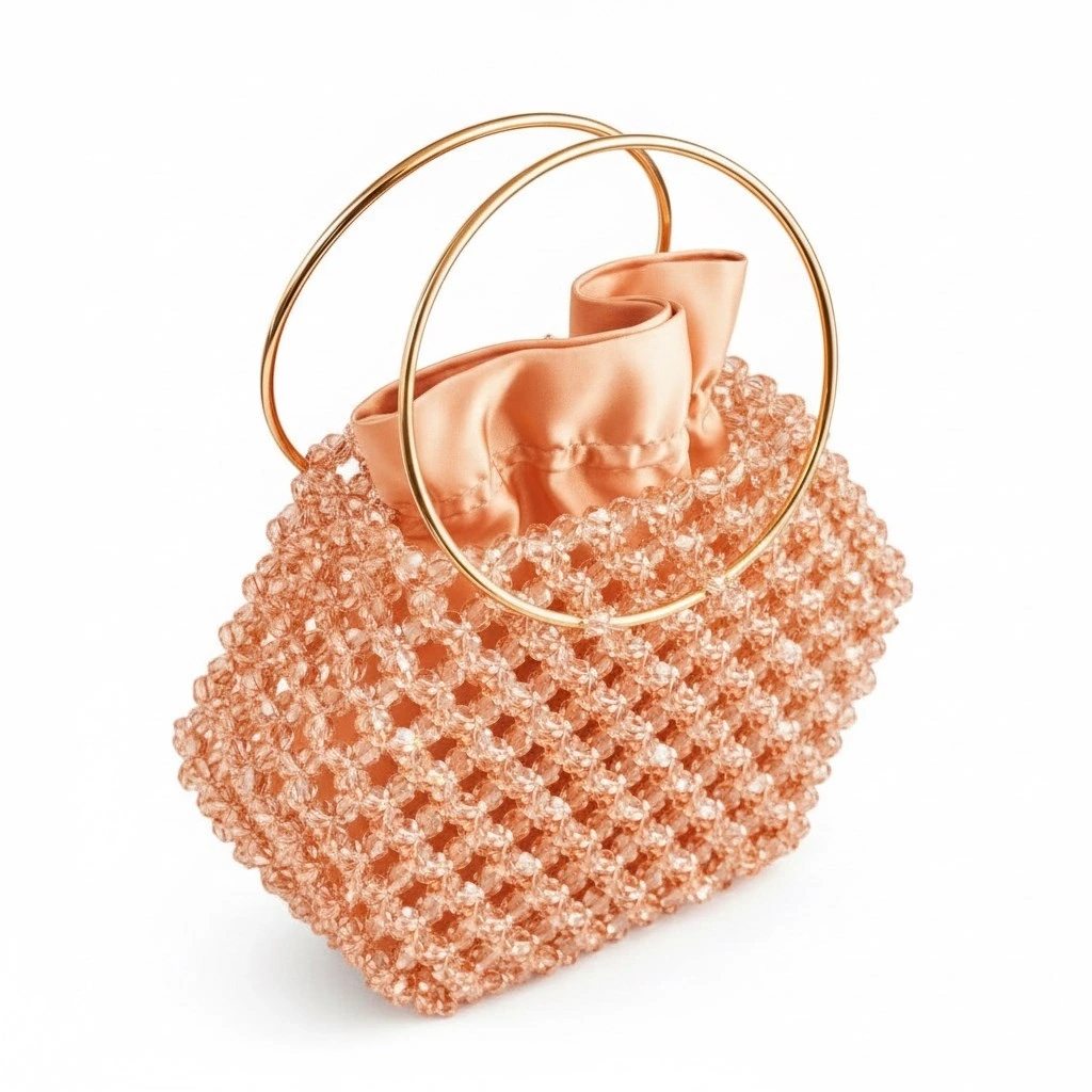 Kristal boncuklar, yüksek dayanımlı misina ile tek tek örülerek çok katmanlı bir yüzey yapısı oluşturur. Bu yapı, çantanın form bütünlüğünü korurken kristal örgünün üç boyutlu etkisini güçlendirir ve yapısal stabilite sağlar.