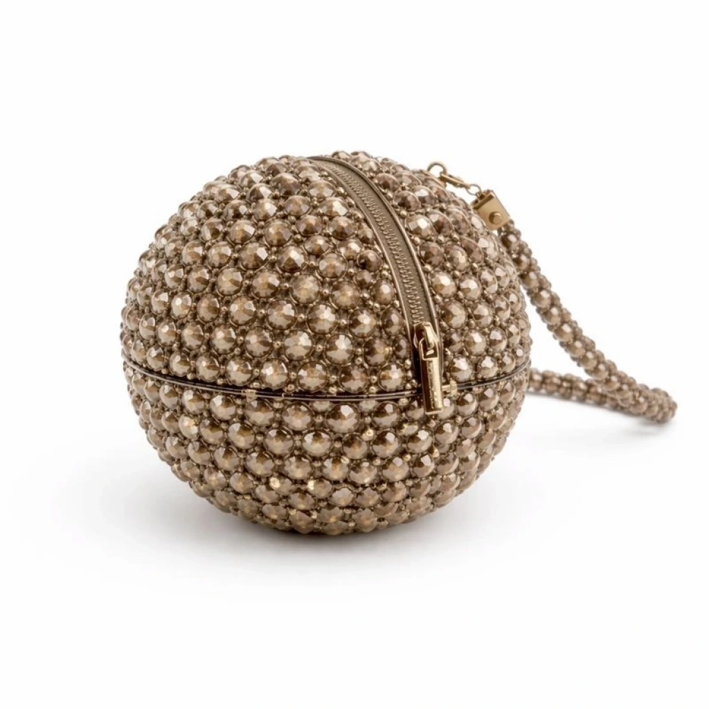 Modelin üst bölümünde yer alan metal fermuarlı kapatma sistemi, küresel yapıya entegre edilerek tasarlanmış; fermuar hattı, form bütünlüğünü bozmadan çantanın çevresini takip edecek şekilde konumlandırılmıştır. Fermuar çekme ucu ve metal aksesuarlar, kristal dokuyla kontrast oluşturmadan, dengeli bir parlaklık sunar.