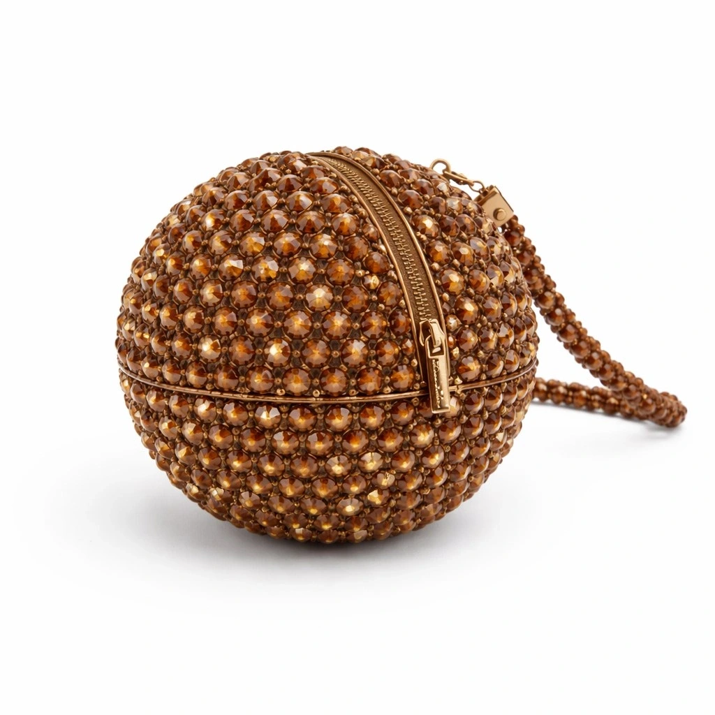 Modelin üst bölümünde yer alan metal fermuarlı kapatma sistemi, küresel yapıya entegre edilerek tasarlanmış; fermuar hattı, form bütünlüğünü bozmadan çantanın çevresini takip edecek şekilde konumlandırılmıştır. Fermuar çekme ucu ve metal aksesuarlar, kristal dokuyla kontrast oluşturmadan, dengeli bir parlaklık sunar.