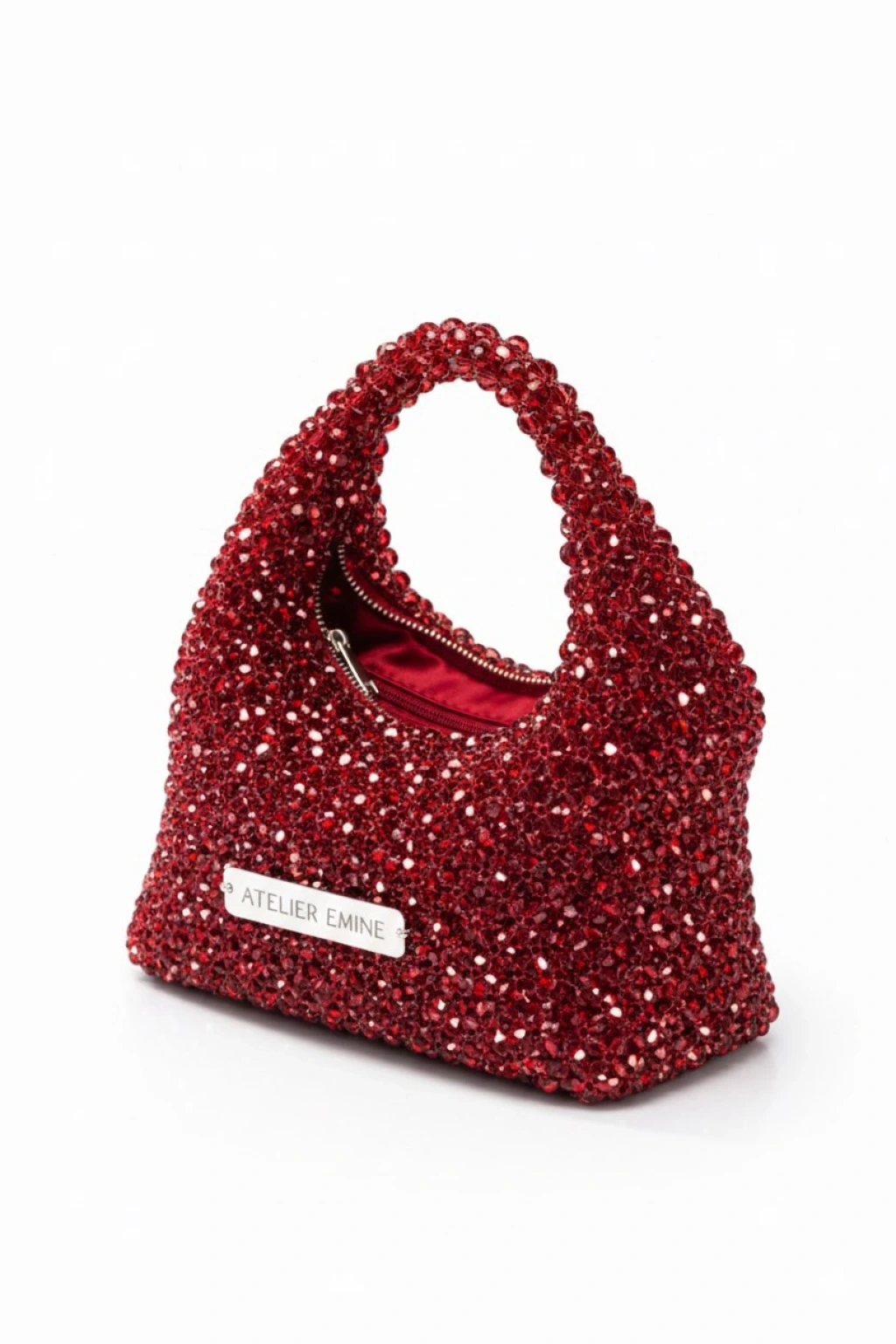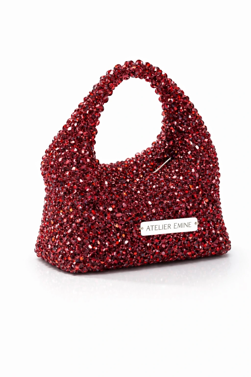 Atelier Emine’in Crystal Gelato Couture koleksiyonuna ait Budino Amarena, 8 mm optik sınıfı kristal boncukların yüksek dayanımlı misina ile tek tek örülmesiyle tamamen el işçiliğiyle üretilmiş, yumuşak geçişli heykelsi formda premium mini çanta modelidir.