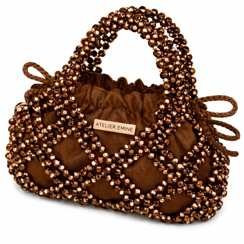 Budino Argilla, Atelier Emine’in Crystal Gelato Couture koleksiyonunda yer alan; tek parça couture yaklaşımıyla ele alınmış, tekstil ve kristal işçiliğinin heykelsi bir birliktelik sunduğu top-handle pouch bag tasarımıdır.
