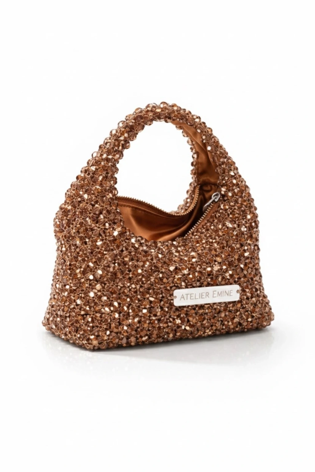 Atelier Emine’in Crystal Gelato Couture koleksiyonuna ait Budino Cacao, 8 mm optik sınıfı kristal boncukların yüksek dayanımlı misina ile tek tek örülmesiyle tamamen el işçiliğiyle üretilmiş, yumuşak geçişli heykelsi formda premium mini çanta modelidir.