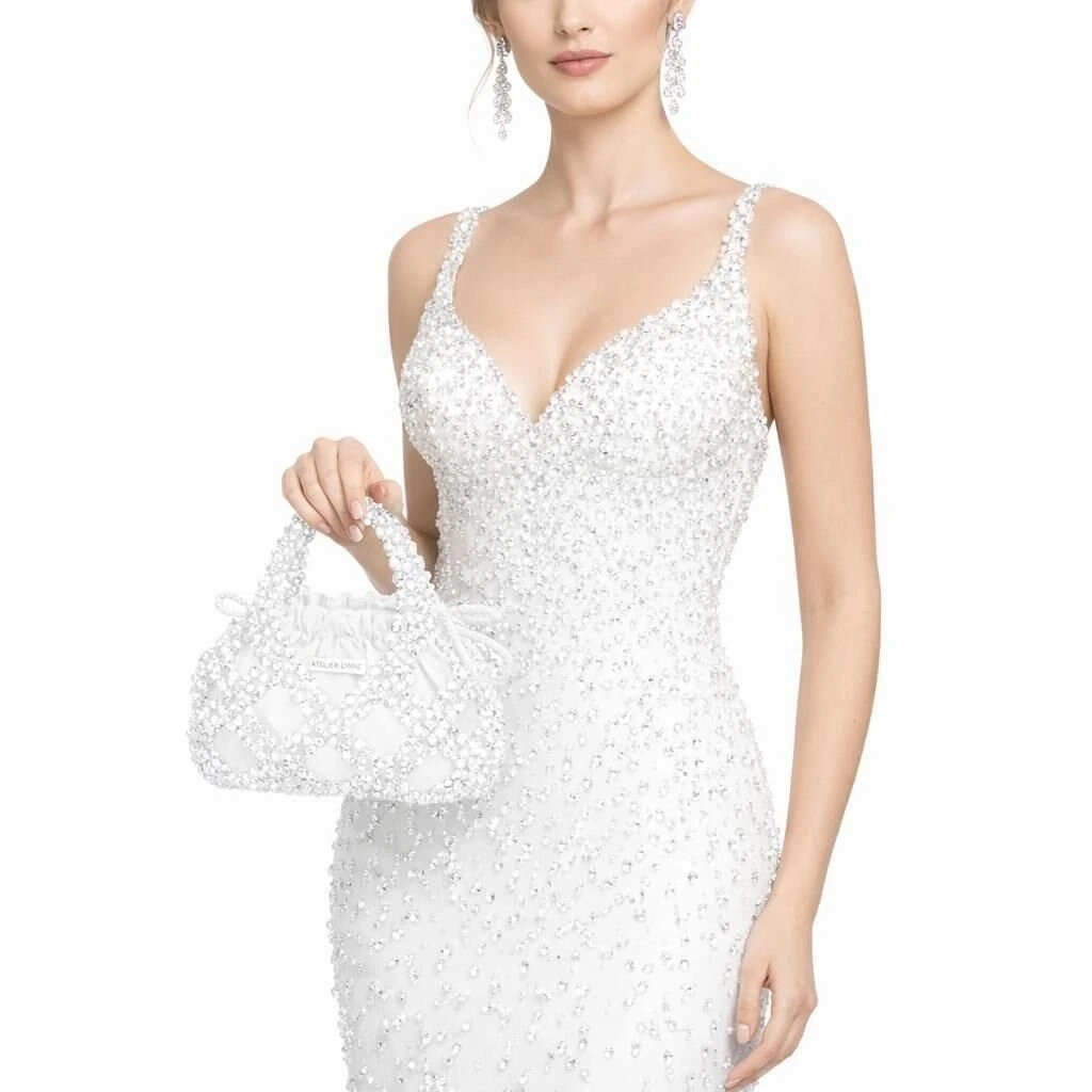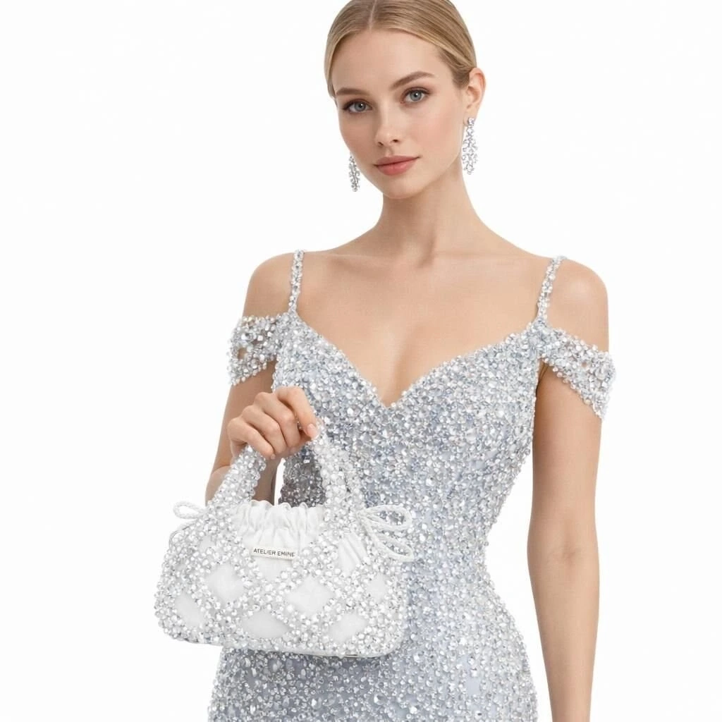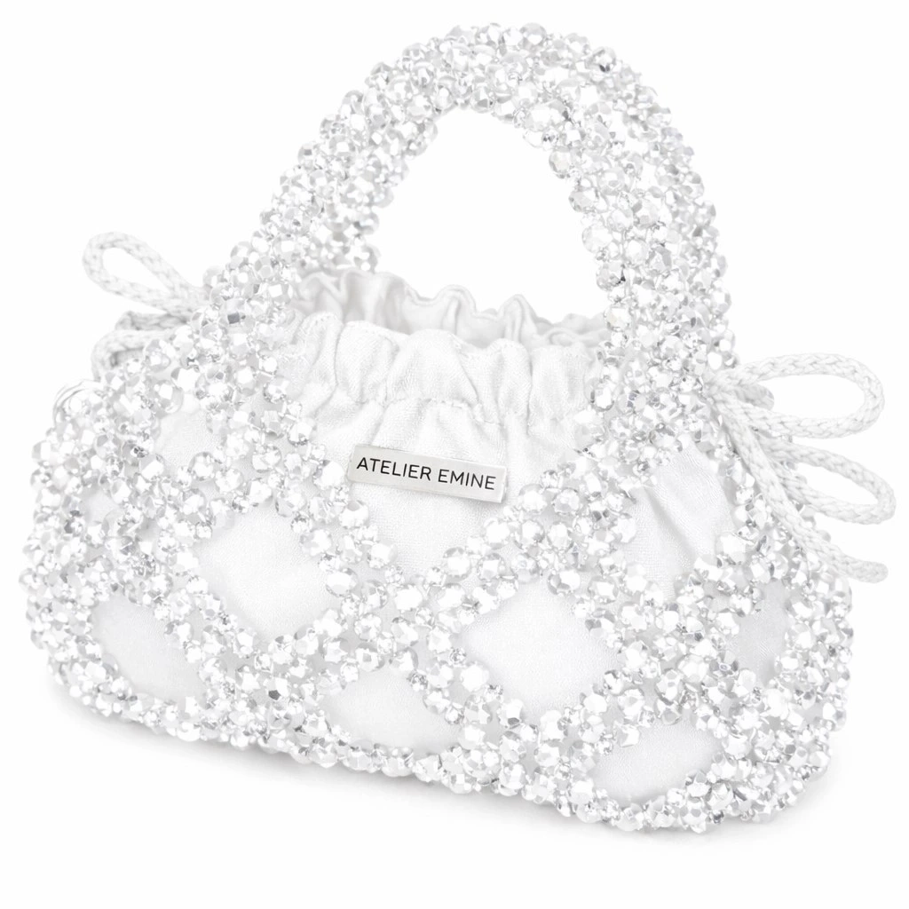 Budino Lattimo, Atelier Emine’in Crystal Gelato Couture koleksiyonunda yer alan; tek parça couture yaklaşımıyla ele alınmış, tekstil ve kristal işçiliğinin heykelsi bir birliktelik sunduğu top-handle pouch bag tasarımıdır.