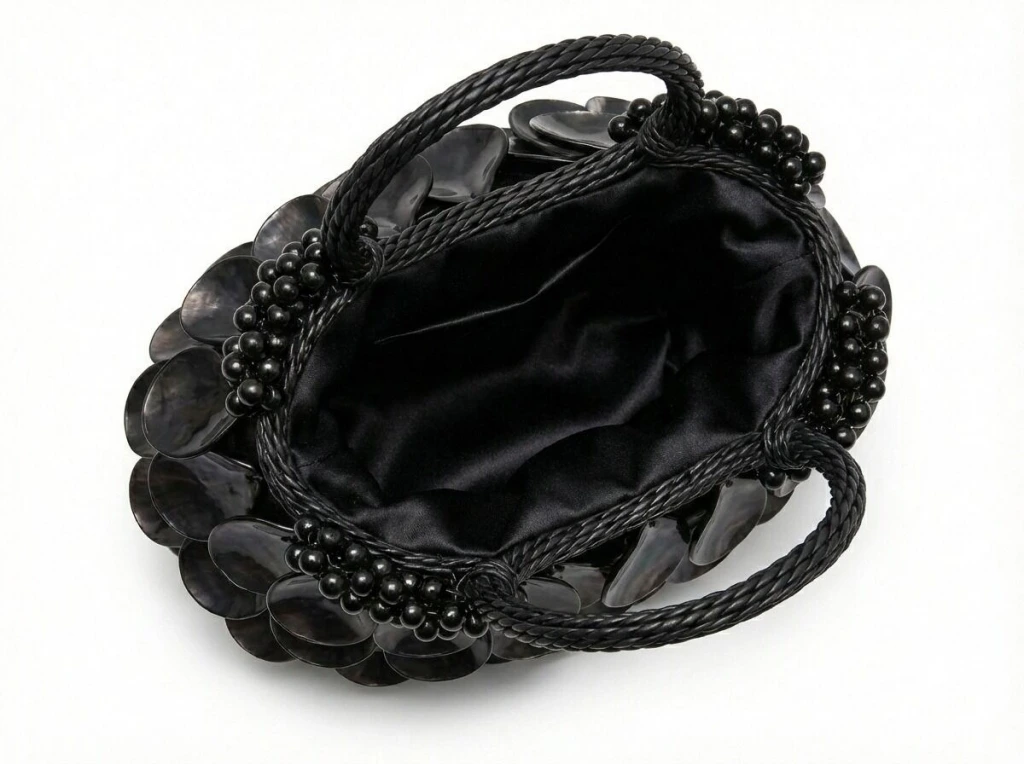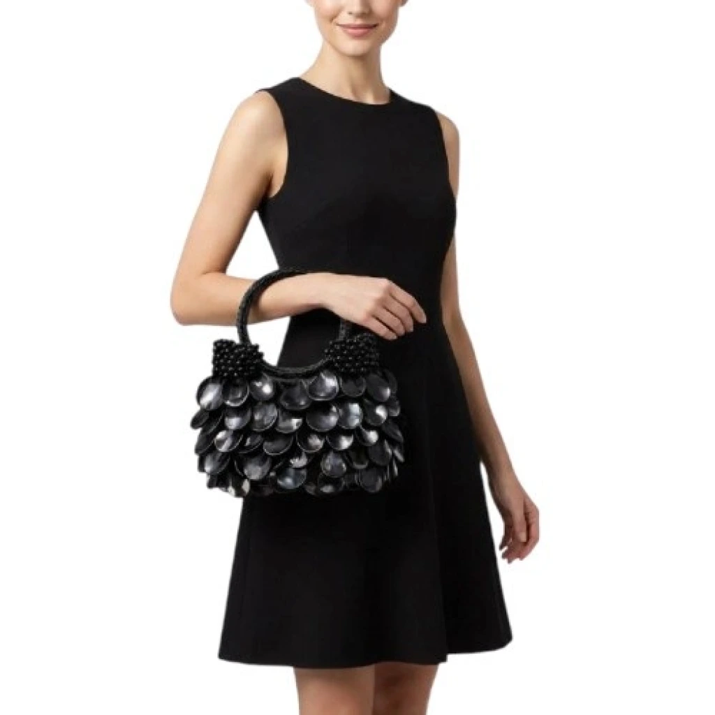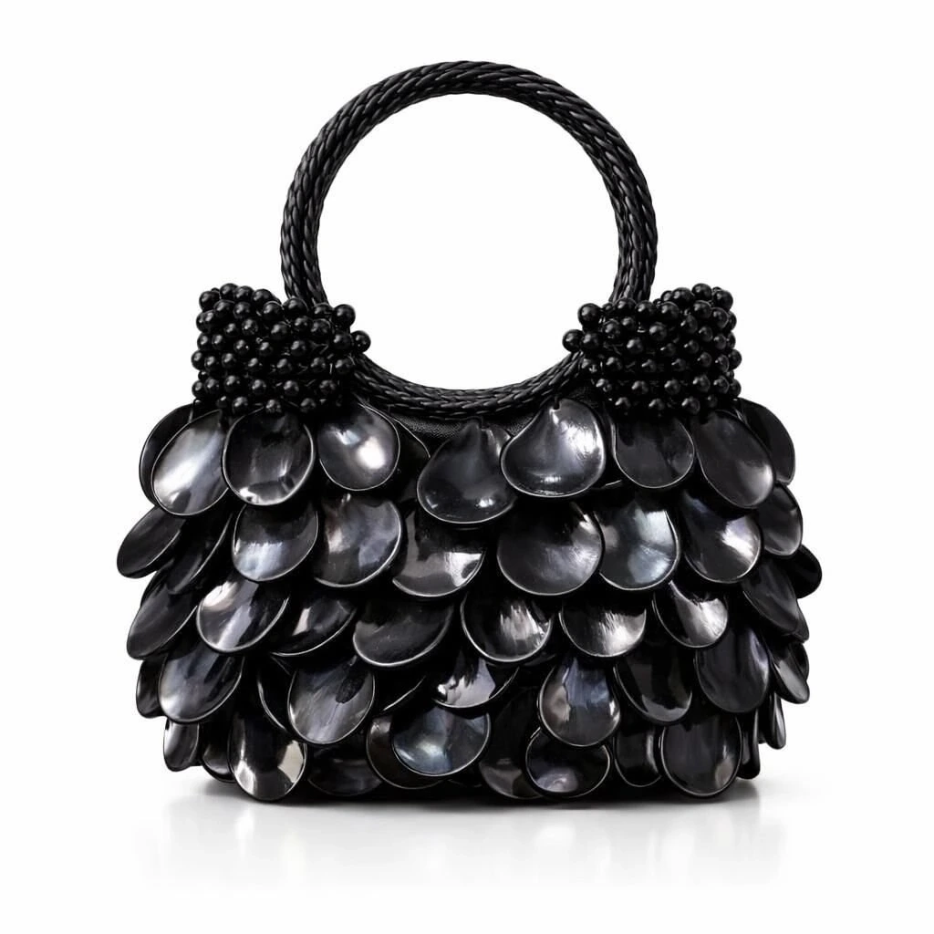 Yüzey formu, organik kesimli doğal sedef disklerin üst üste bindirilmesiyle oluşturulmuş çok katmanlı bir modül yapısına sahiptir. Bu yapı, çanta gövdesinde kontrollü bir hacim derinliği ve dinamik bir yüzey hareketi yaratırken, ışıkla temas eden her modülün bağımsız kırılım üretmesini sağlayacak biçimde konumlandırılmıştır. Katmanlar arasındaki milimetrik aralıklar, yüzeyde doğal bir akış hissi ve sofistike bir doku sürekliliği oluşturur.