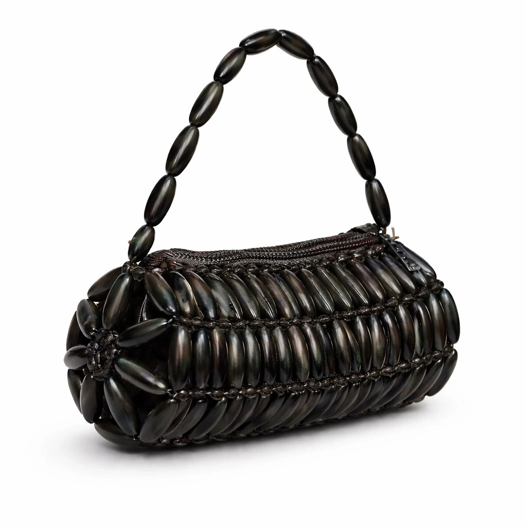 Model, gövdeyle birebir uyumlu şekilde tasarlanmış, doğal sedef modüllerden oluşan kısa el askısına sahiptir. Askı, elde taşımaya uygun ergonomik bir kavrama sunacak şekilde optimize edilmiş; bağlantı noktaları, taşıma sırasında yük dağılımını dengeleyerek yapısal stabiliteyi destekleyecek biçimde güçlendirilmiştir.