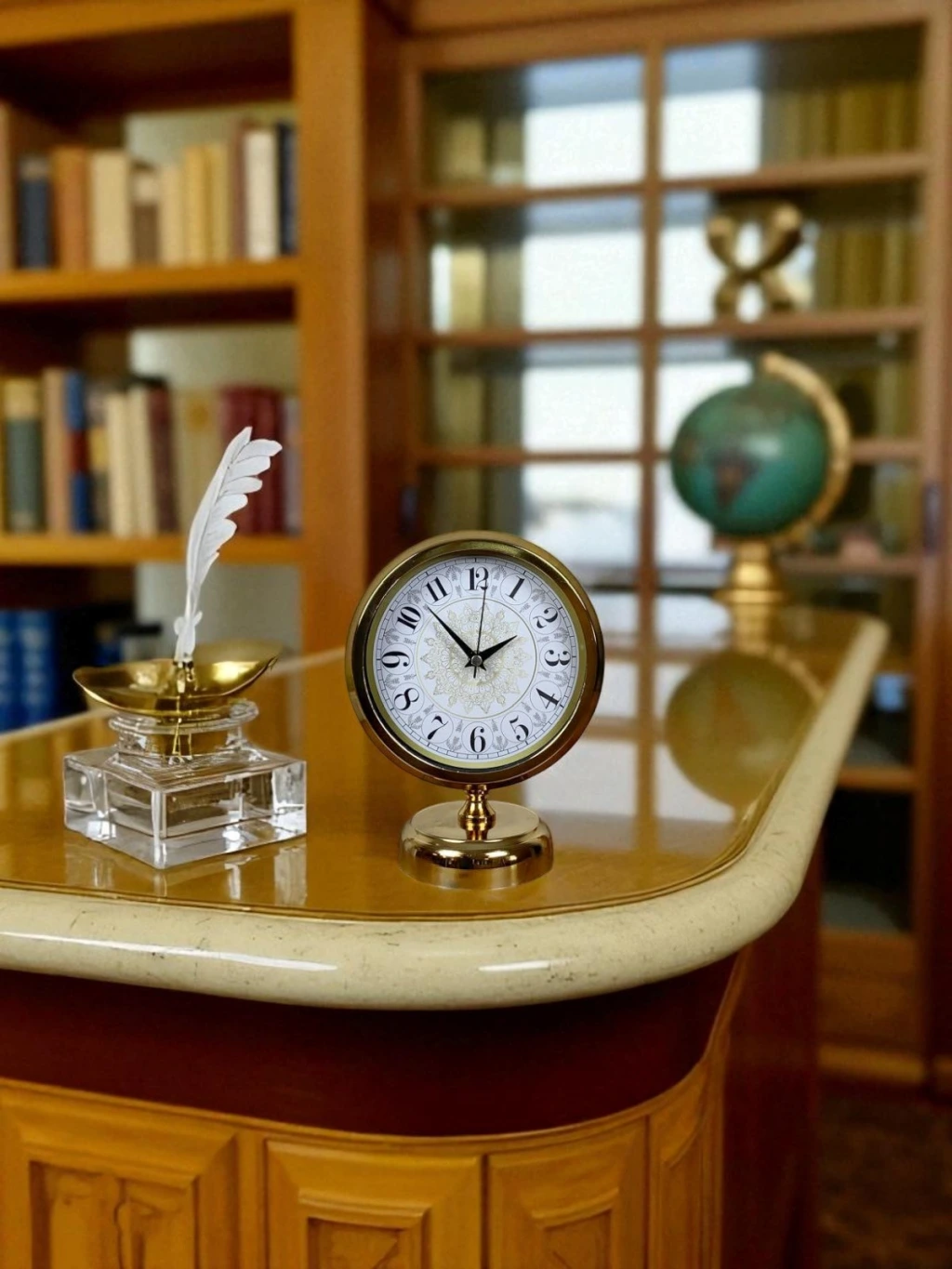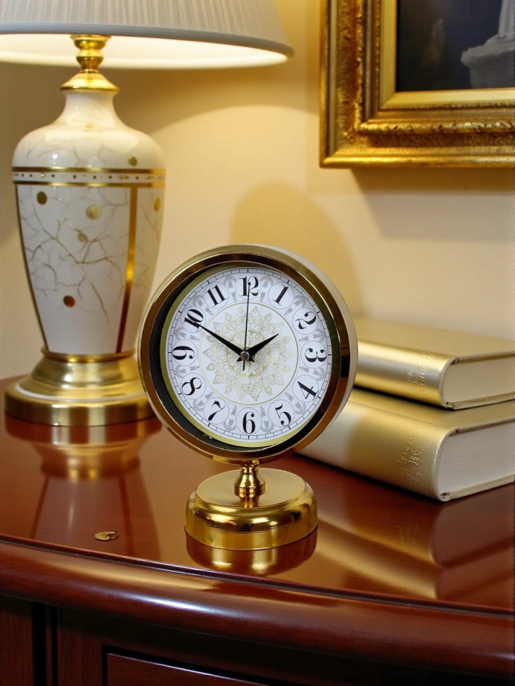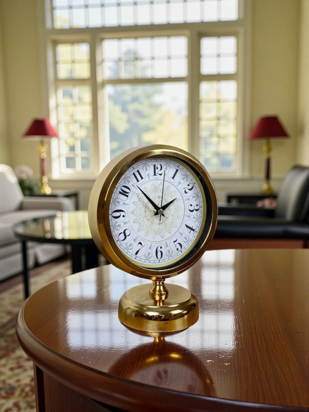 Dengeli ve sağlam metal tabanı sayesinde masa üzerinde güvenli bir duruş sergiler. Ne çok büyük ne de küçük olan ideal ölçüsüyle (25 x 20 cm), hem dekoratif hem de işlevsel bir kullanım sunar. Klasik, vintage ve lüks dekorasyon tarzlarını tamamlayan bu masa saati; konsol, kitaplık, sehpa ve ofis masalarında şık bir tamamlayıcı olarak öne çıkar.