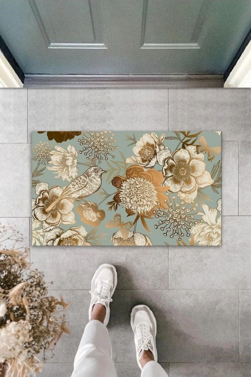 Dekoratif Dijital Baskı Turkuaz-Gold Kuş Dış Mekan Paspas K-2100