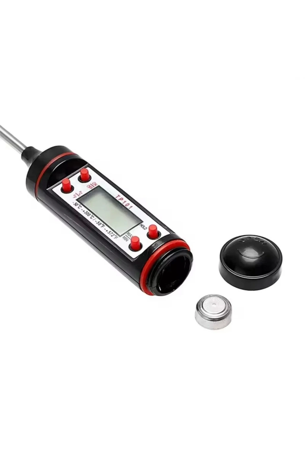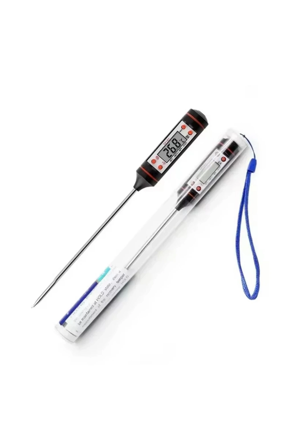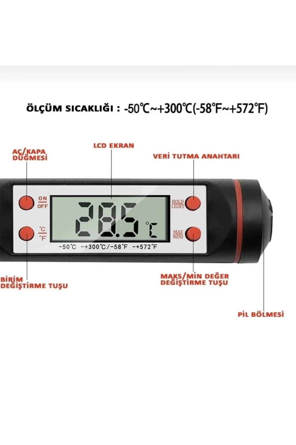Bu pratik dijital gıda termometresi , sıvı ve katı gıdaların sıcaklık ölçümünde mutfaktaki en büyük yardımcınız olacak.; Paslanmaz çelik probu sayesinde et, tavuk, balık, süt, su, çorba gibi birçok gıdanın iç sıcaklığını anında ölçebilirsiniz.; Hassas sensörü ve hızlı tepki süresiyle güvenli ve doğru sonuçlar sunar.; Şeflerden ev kullanıcılarına herkes için uygundur.; ✨ Öne Çıkan Özellikler ✅ Geniş Ölçüm Aralığı: -50°C ~ +300°C ✅ Paslanmaz çelik prob – hijyenik ve dayanıklı ✅ Hızlı tepki süresi ve net LCD ekran ✅ Açma/kapama ve °C/°F dönüşüm düğmesi ✅ Otomatik kapanma özelliğiyle pil tasarrufu ✅ Kolay temizlenebilir ve taşınabilir yapı ? Kullanım Alanları Et, tavuk, balık pişirme sıcaklığı kontrolü Bebek maması veya banyo suyu sıcaklık ölçümü Süt, kahve, çay gibi sıvıların ideal sıcaklıkta servis edilmesi Ekmek hamuru veya çikolata eritme işlemlerinde hassas sıcaklık takibi ? Kullanım Talimatı Koruma kapağını çıkarın ve cihazı açma düğmesine basarak aktif edin.; Paslanmaz çelik probu ölçüm yapılacak sıvıya ya da gıdaya batırın.; LCD ekranda sıcaklık değeri birkaç saniye içinde görüntülenir.; Ölçüm tamamlandıktan sonra cihazı kapatın ve probu temizleyip kurulayın.; Koruma kapağını tekrar takarak muhafaza edin.; ? Not: Ürün paslanmaz çeliktir.; Ancak tüm paslanmaz çeliklerde olduğu gibi, zorlu koşullarda (örneğin uzun süre nemli kalma, tuzlu su teması, yetersiz kurutma gibi durumlarda) zamanla yüzeysel pas lekeleri oluşabilir.; Kullanım sonrası kurulanması önerilir