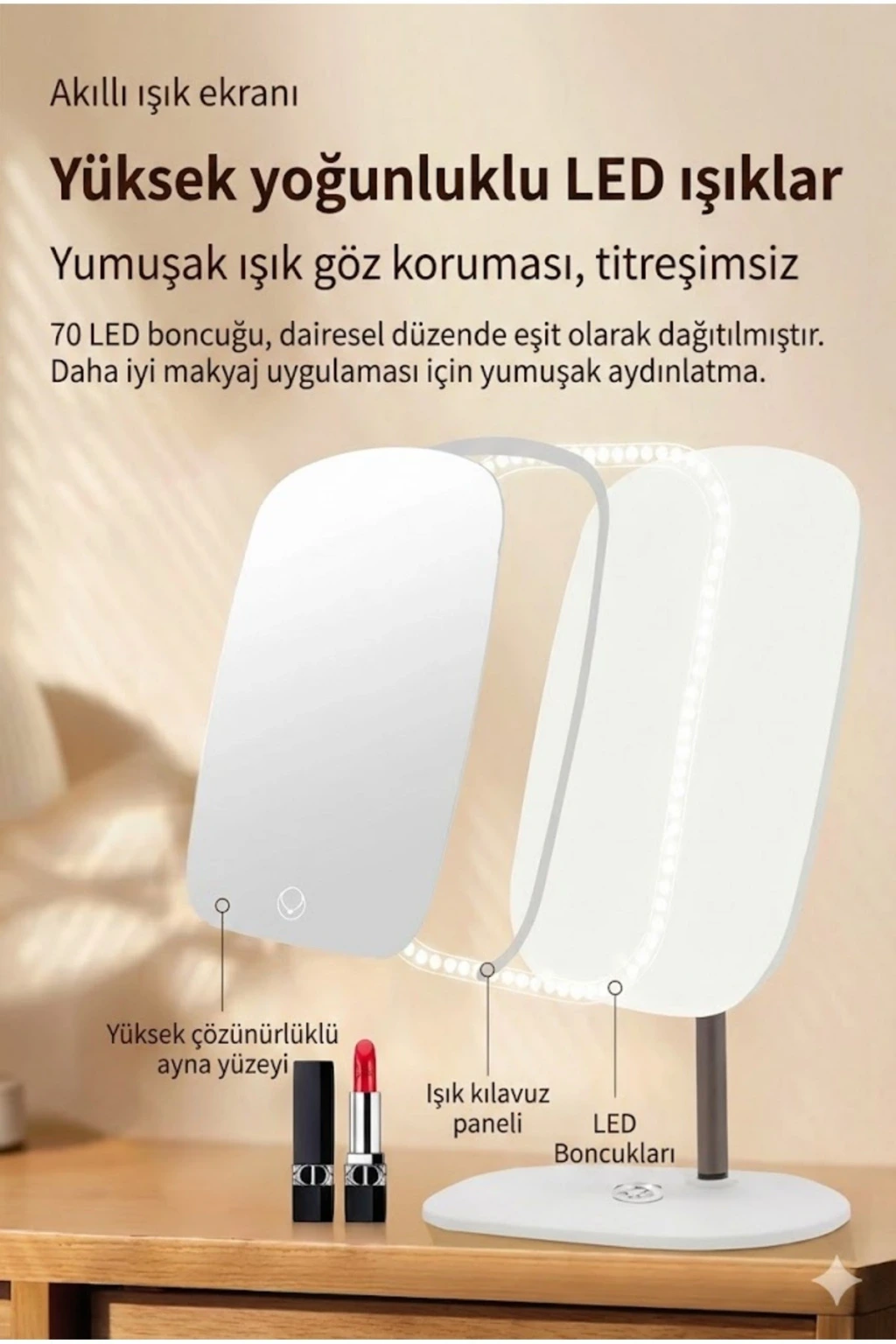 - Modern ve şık tasarımıyla dikkat çeken bu makyaj aynası, günlük kullanımınızda pratiklik sağlar.; - Üç farklı renk seçeneği ile her türlü aydınlatma koşuluna uyum sağlayarak ideal görünümü sunar.; - Yüksek kaliteli plastik materyali sayesinde uzun ömürlü kullanım vaat ederken, kolay temizlenebilir özelliğiyle hijyenik bir deneyim sunar.; - Dikdörtgen şekli sayesinde geniş görüş alanı sağlayarak makyaj yaparken veya diğer kişisel bakım işlemlerini gerçekleştirmenize olanak tanır.