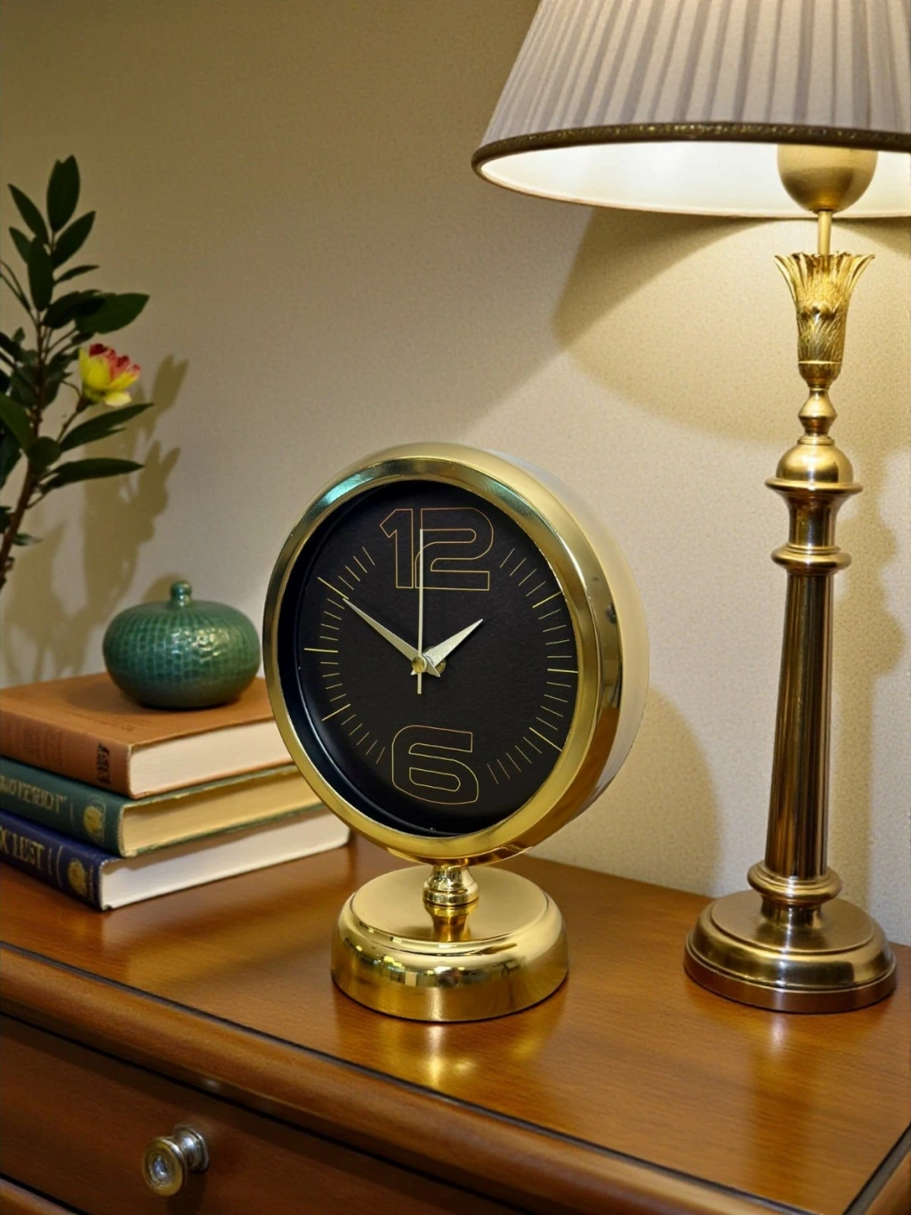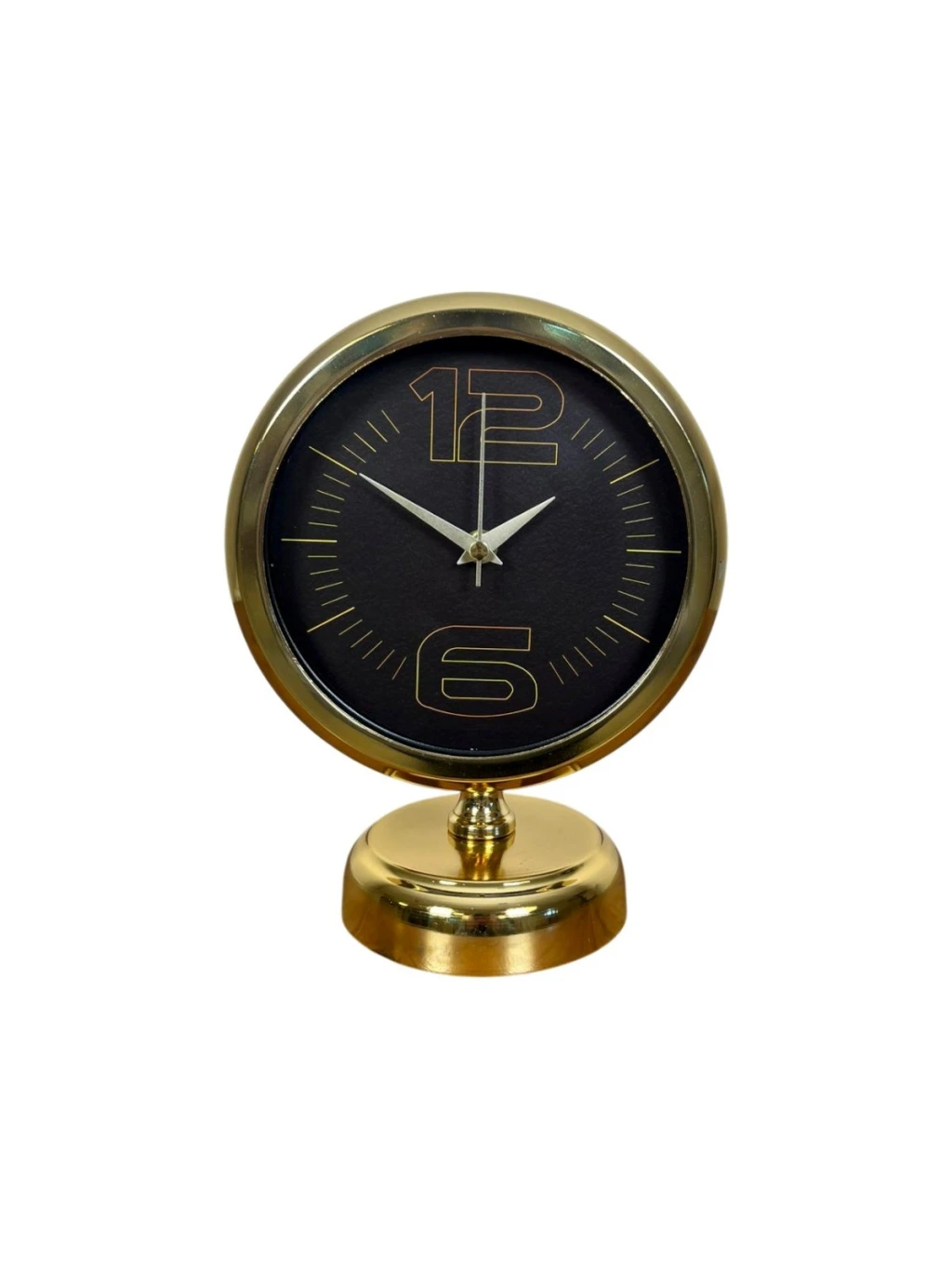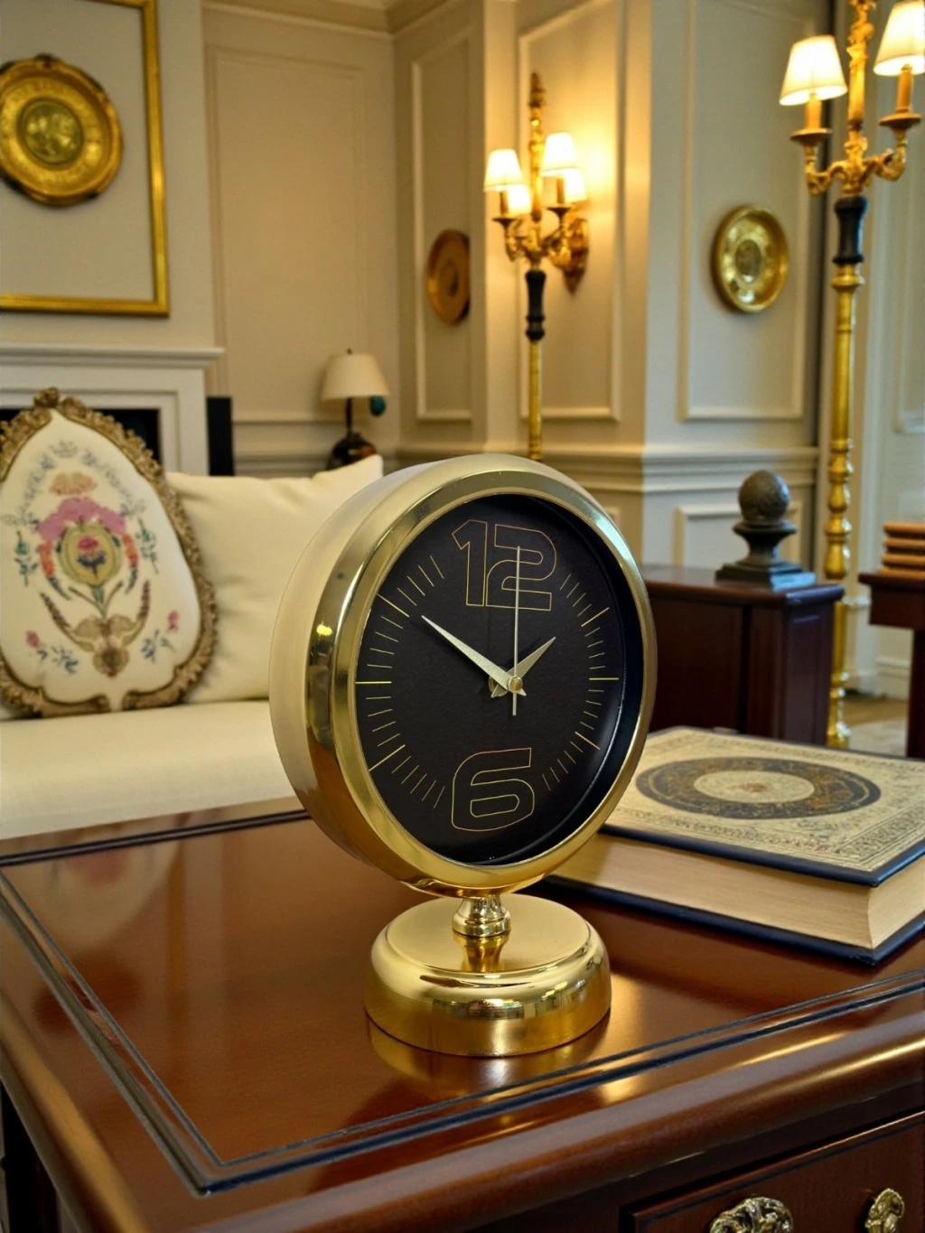 Dekorasyonda güçlü bir etki yaratmak isteyenler için tasarlanan bu siyah kadranlı gold masa saati, modern çizgileriyle dikkat çekerken gold gövdesiyle ortama premium bir şıklık kazandırır. Minimal ve güçlü tasarımı sayesinde hem ev hem ofis kullanımına uygundur; çalışma masanızda profesyonel bir atmosfer oluşturur, salon konsolunda ise dekoru tamamlayan zarif bir aksesuar gibi durur.