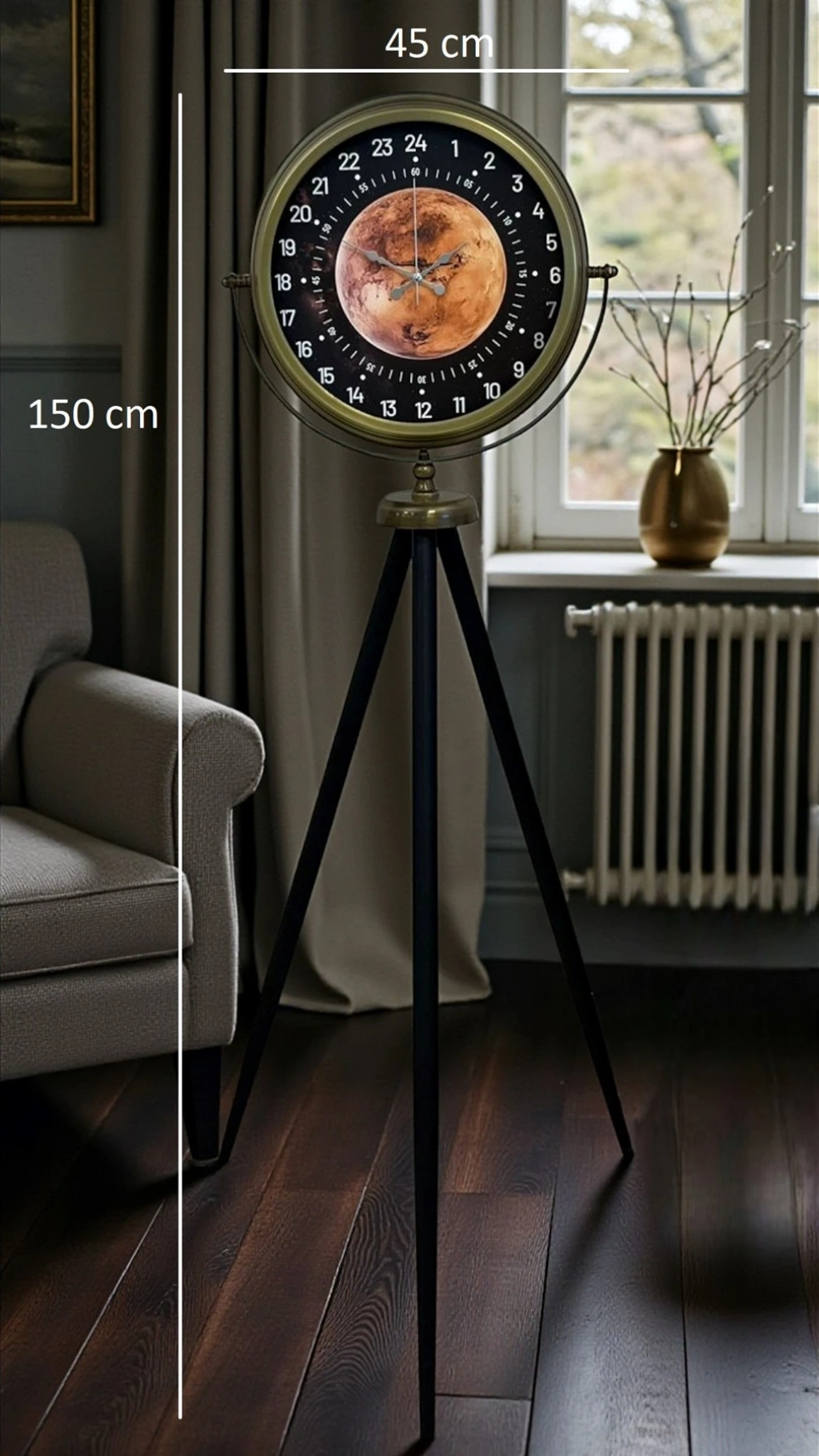 Klasik saat anlayışının çok ötesine geçen bu eskitme tripod ayaklı 24 saat göstergeli dekoratif saat, mekânlara yalnızca zamanı değil; karakter, derinlik ve özgünlük kazandırmak için tasarlandı. Alışılmış 12 saatlik sistemden farklı olarak 24 saatlik zaman dilimine sahip özel kadranı, bu modeli benzerlerinden net bir şekilde ayırır ve koleksiyon değeri taşır.