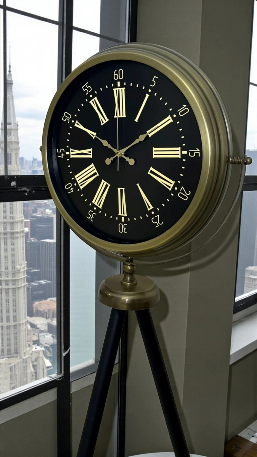 Siyah kadran üzerine yerleştirilen gold tonlu Roma rakamları, saate asil ve zamansız bir karakter kazandırır. Kadrandaki klasik detaylar, eskitme metal kasa ile birleşerek vintage ve modern çizgiyi kusursuz şekilde dengeler. Tripod ayaklı yapısı; ürüne hem heykelsi bir duruş hem de sağlam ve dengeli bir kullanım sunar. Özellikle loft, endüstriyel, klasik, vintage ve modern klasik dekorasyon stillerinde çok güçlü bir tamamlayıcıdır.