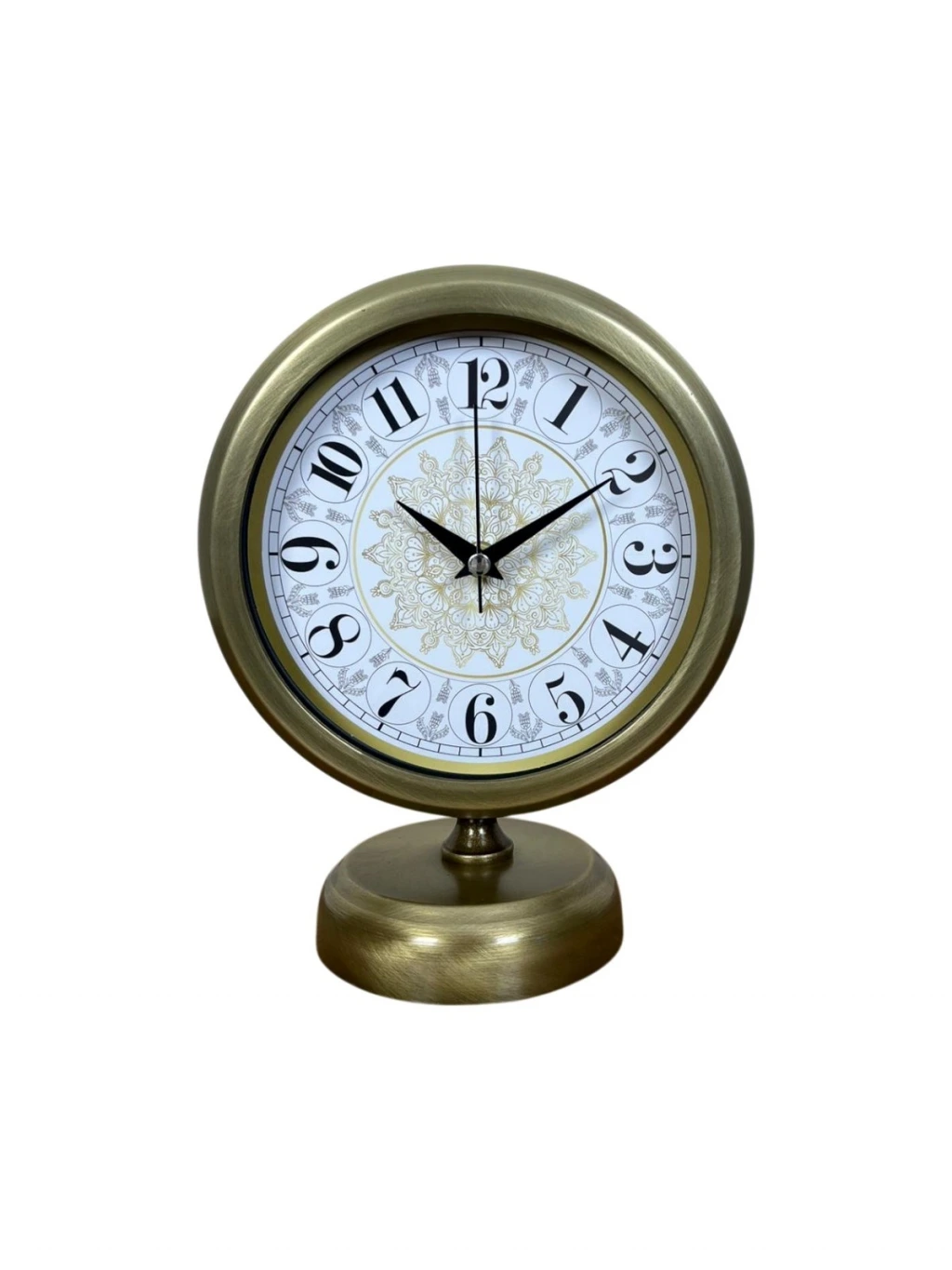 Klasik detayları ve eskitme gold gövdesiyle dikkat çeken bu masa saati, bulunduğu ortama zarafet ve karakter kazandırmak üzere tasarlanmıştır. Özel desenli kadranı, geleneksel motiflerle modern çizgileri bir araya getirerek dekorasyonda güçlü bir estetik sunar. 25 x 20 cm ölçüsü sayesinde masa, konsol, vitrin, kitaplık veya ofis masası üzerinde ideal bir kullanım sağlar.
