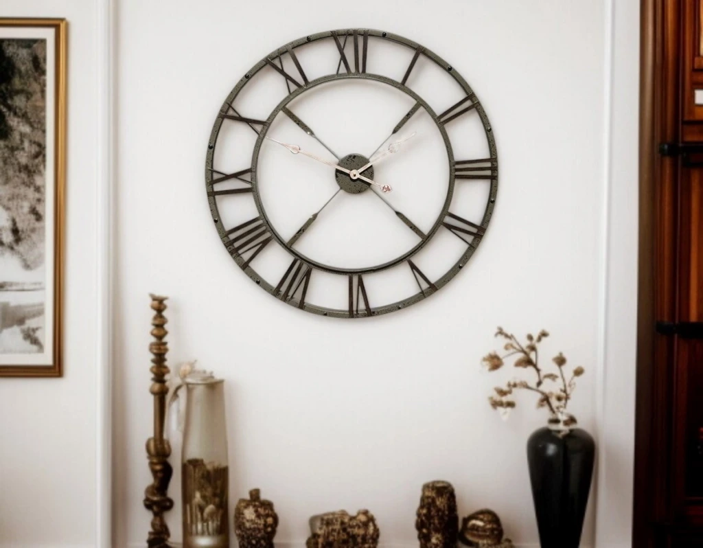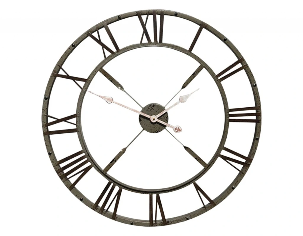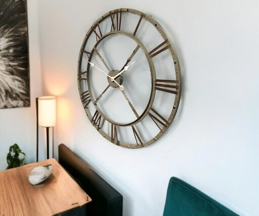 73 cm geniş çapı ve Roma rakamlı iskelet tasarımı ile öne çıkan bu eskitme vintage duvar saati, klasik saat estetiğini modern ve endüstriyel dekorasyon anlayışıyla bir araya getirir. Açık kadran yapısı sayesinde duvarla bütünleşir ve mekâna derinlik kazandırarak sıradan duvar saatlerinden ayrılır.