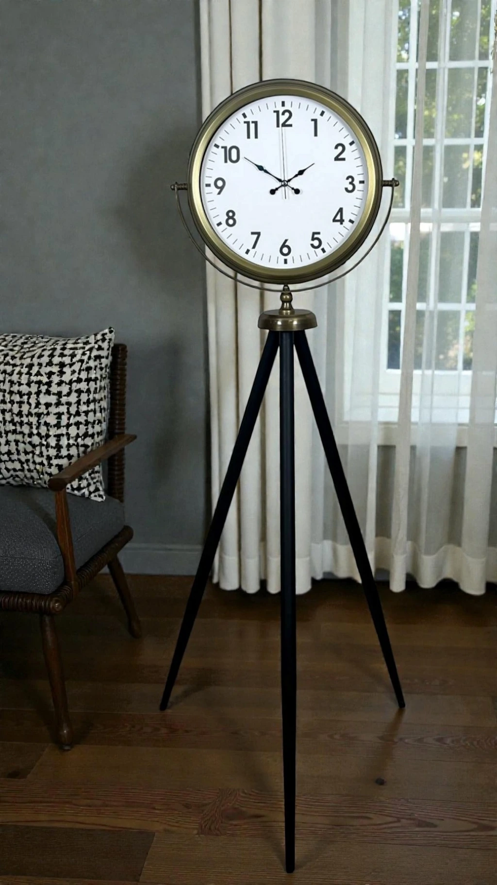 Tripod (üç ayaklı) yapısı, duvara montaj ihtiyacını ortadan kaldırır. İstediğiniz alana kolayca konumlandırabilir; dekorasyonunuzu taşımadan, delmeden, uğraşmadan zenginleştirebilirsiniz. Eskitme detaylar ürüne nostaljik bir hava verirken, minimal kadran tasarımı modern çizgiyi korur. Kısacası: vintage ruh + modern duruş tek üründe buluşur.