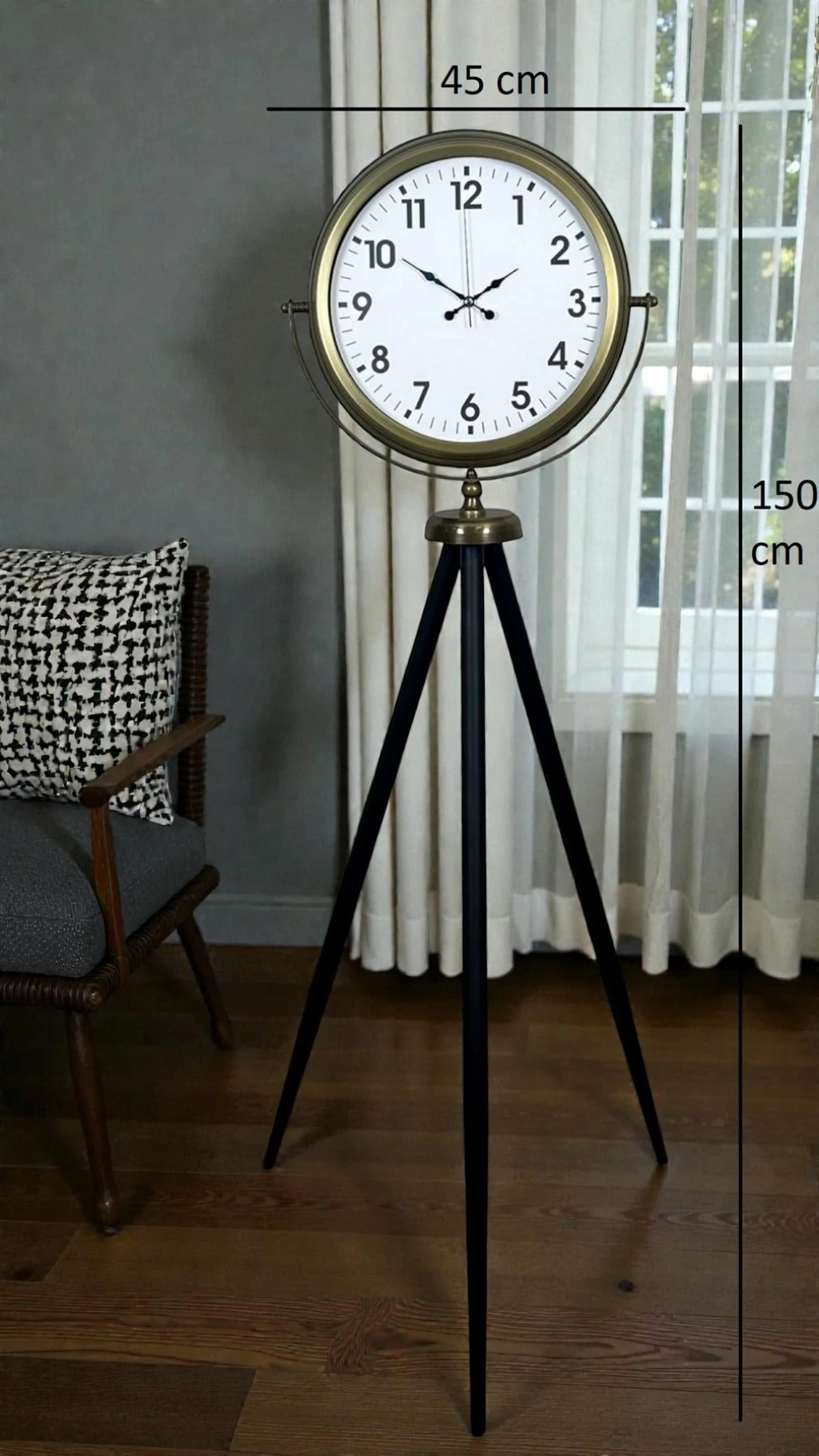 Dekorasyonda fark yaratmak isteyenler için tasarlanan Eskitme Tripod Ayaklı Büyük Boy Saat, 150 cm yüksekliği ve 45 cm genişliğiyle bulunduğu ortamda “tek parça ile” güçlü bir stil oluşturur. Vintage eskitme tonlarıyla tamamlanan gövdesi ve modern tripod ayak tasarımı; hem klasik hem endüstriyel hem de modern dekorasyonlara rahatça uyum sağlar. Salon köşesi, ofis, giriş holü, otel lobisi, kafe/restoran gibi alanlarda dikkat çeken bir odak noktası olur.
