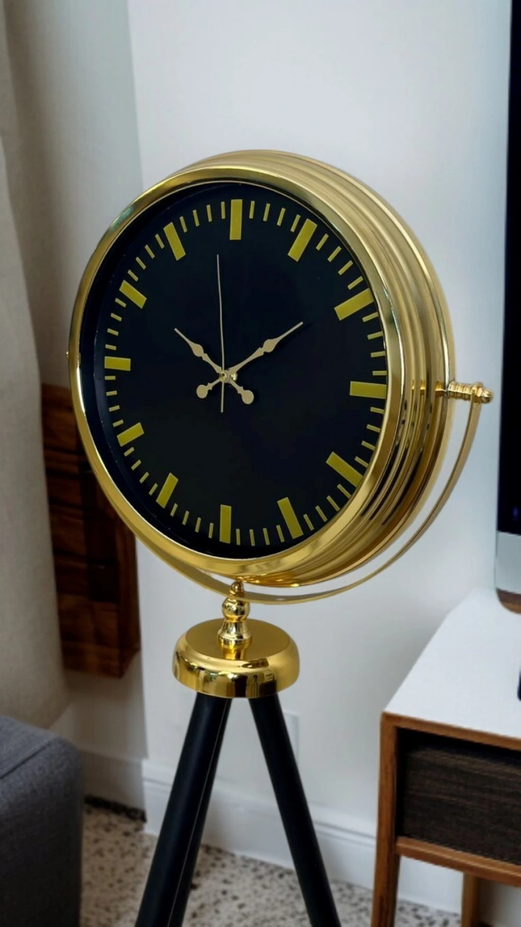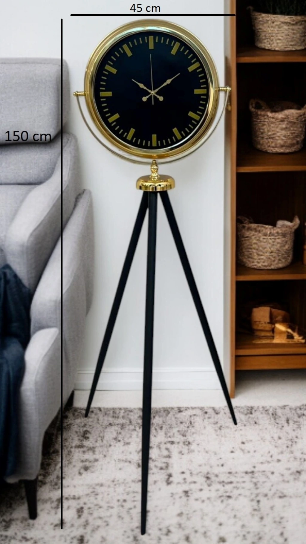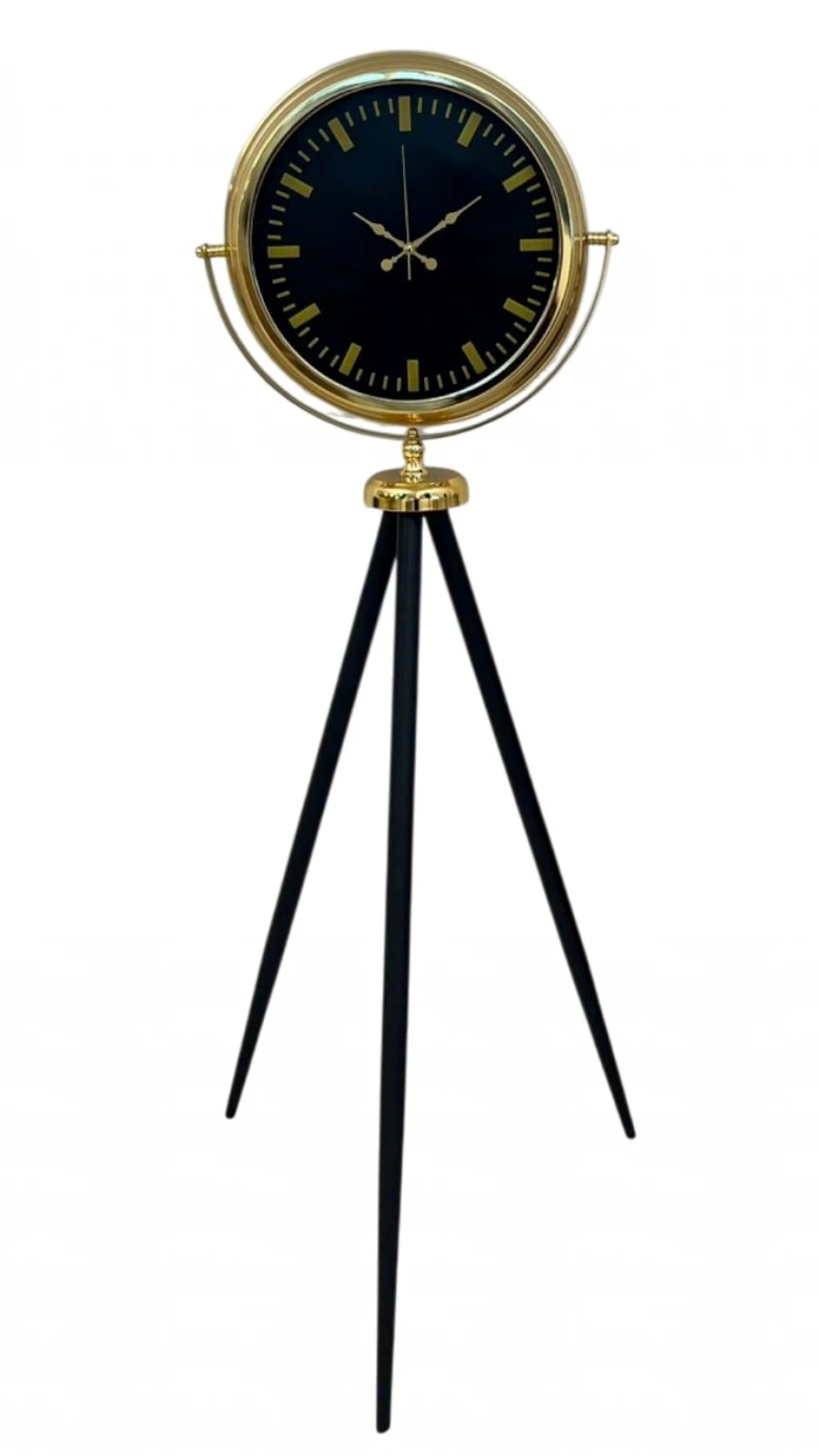 Modern tasarımı zamansız şıklıkla buluşturan bu gold tripod ayaklı yer saati, güçlü duruşu ve dengeli oranlarıyla bulunduğu mekânda hemen fark edilir. Siyah kadranın asaleti, gold metal çerçeve ve detaylarla kusursuz bir uyum yakalayarak hem modern hem de klasik dekorasyon stillerine rahatlıkla eşlik eder. Ev, ofis, showroom, otel lobisi veya prestijli yaşam alanları için dekoratif olduğu kadar fonksiyonel bir tamamlayıcıdır.