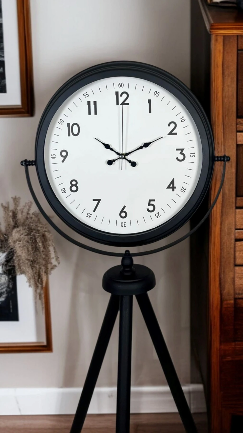 Üç ayaklı tripod formu, bu saati klasik yer ve duvar saatlerinden ayırarak dekoratif bir obje niteliği kazandırır. Dengeli ayak yapısı sayesinde zeminde sağlam durur, güvenli kullanım sağlar. Siyah metal gövdesi hem modern hem de endüstriyel dekorasyon stilleriyle mükemmel uyum sağlarken; klasik mekânlarda da güçlü bir kontrast oluşturarak şıklığı ön plana çıkarır.