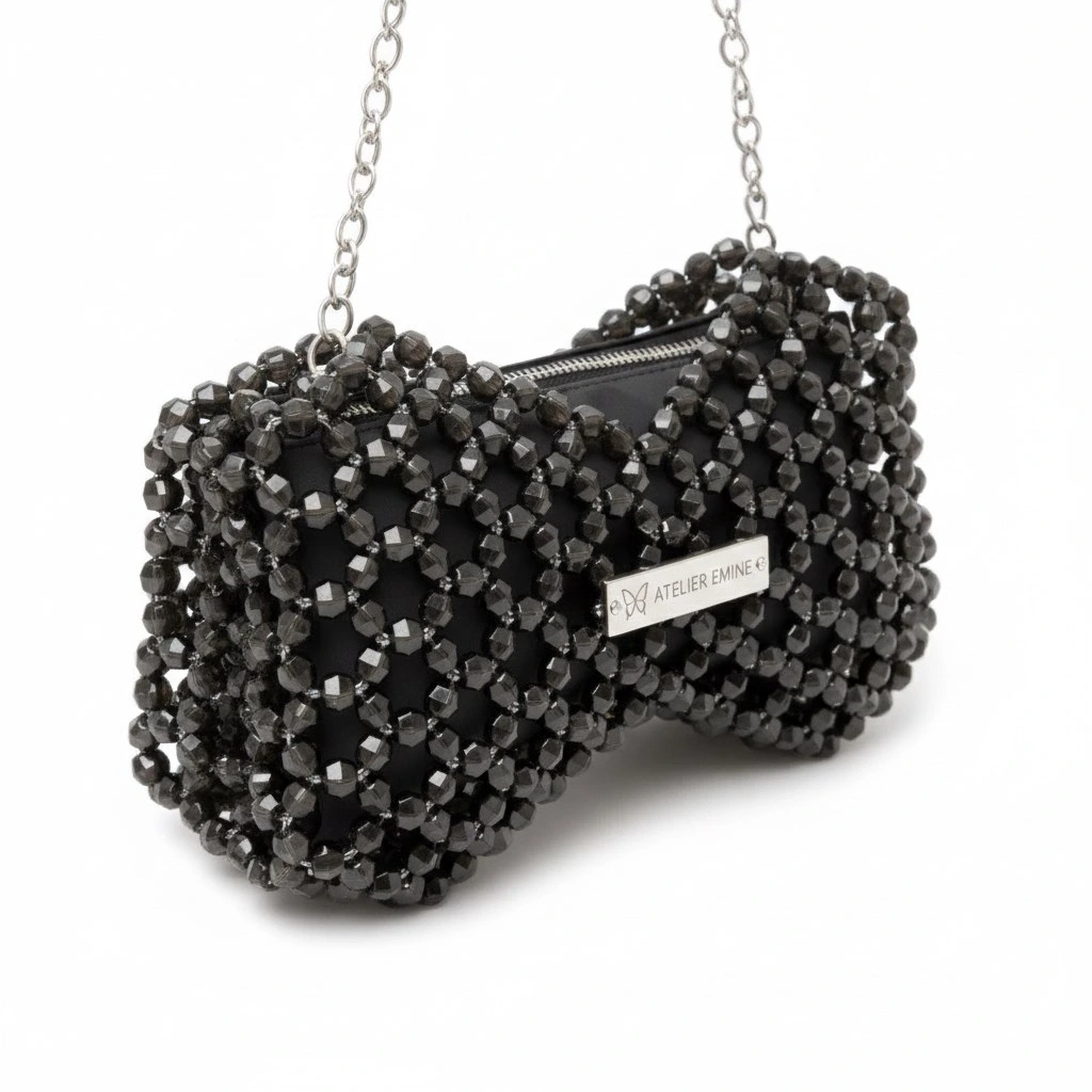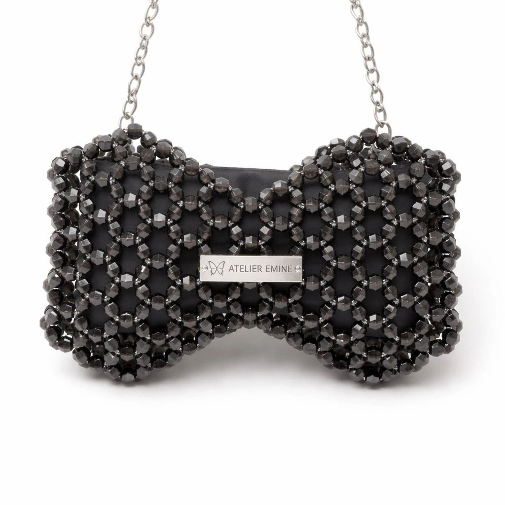 Kristal boncuklar, yüzeyde güçlü bir doku derinliği ve net ışık kırılımı oluşturacak şekilde yoğun ve modüler bir örgü sistemiyle tek tek işlenmiştir. Gövde, iki simetrik hacmin merkezde birleştiği fiyonk siluetiyle yapılandırılarak güçlü bir görsel kimlik elde edilmiştir.