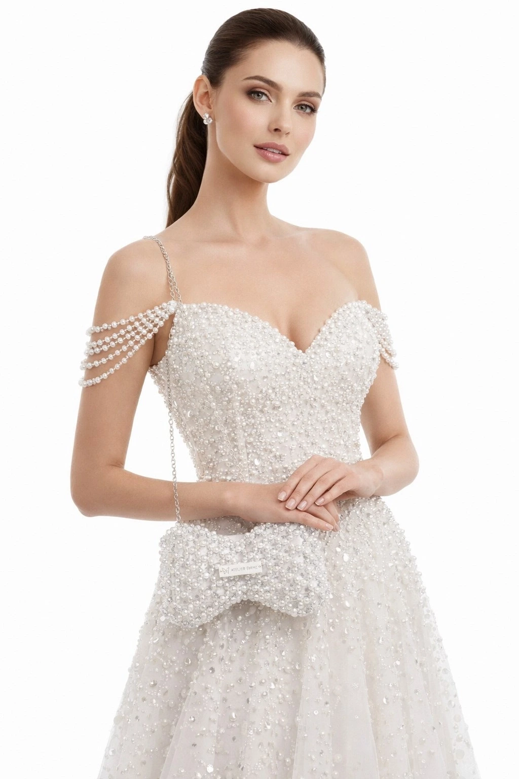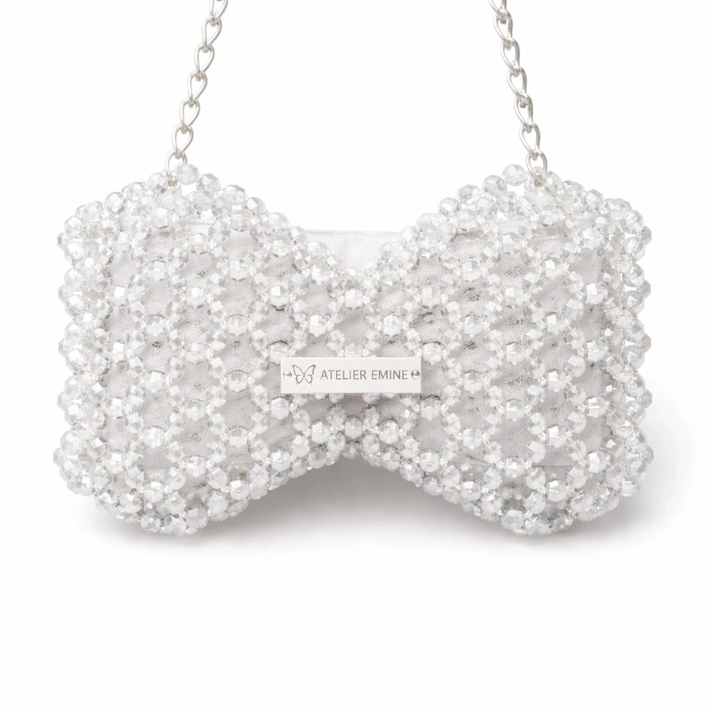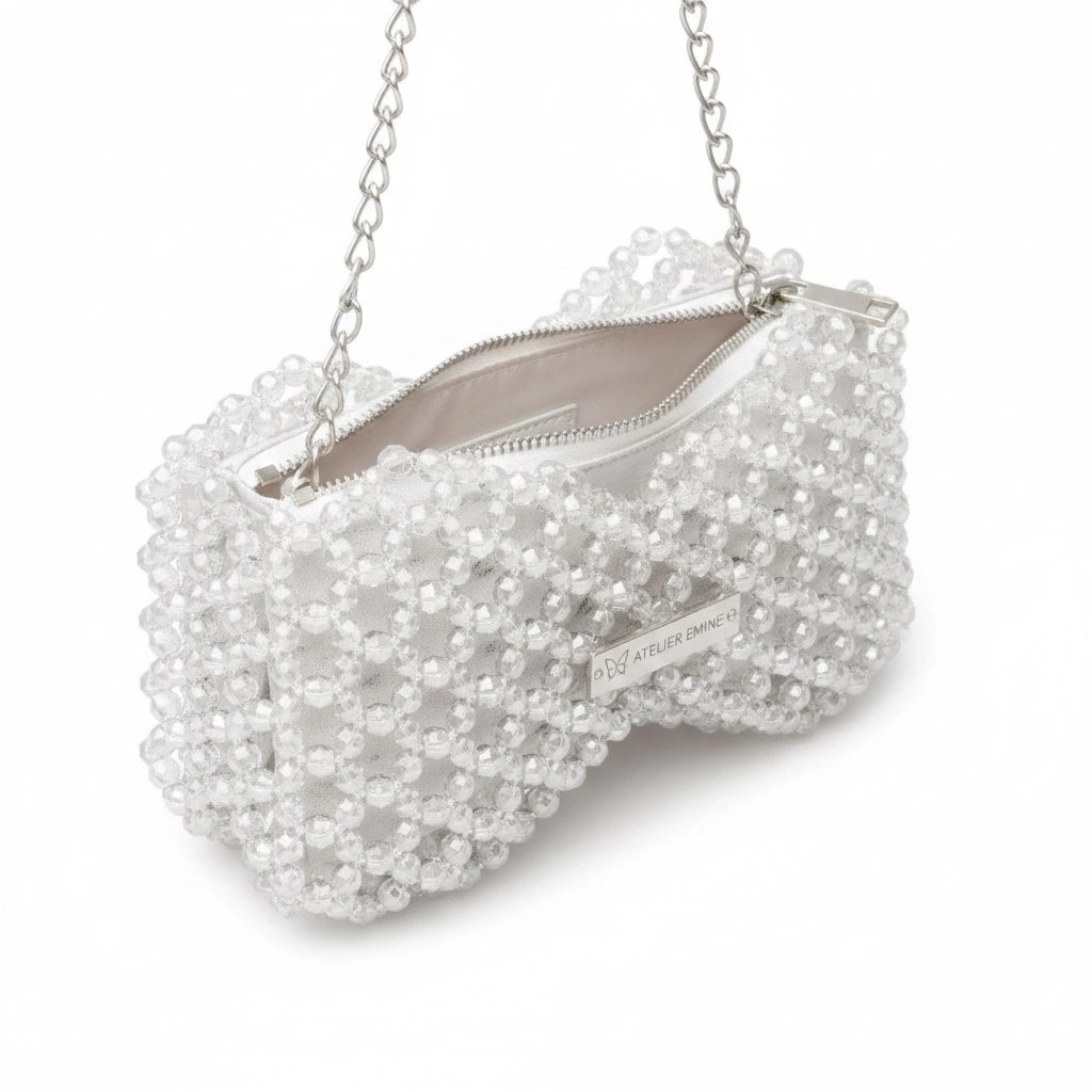 Kristal boncuklar, yüzeyde güçlü bir doku derinliği ve net ışık kırılımı oluşturacak şekilde yoğun ve modüler bir örgü sistemiyle tek tek işlenmiştir. Gövde, iki simetrik hacmin merkezde birleştiği fiyonk siluetiyle yapılandırılarak güçlü bir görsel kimlik elde edilmiştir.