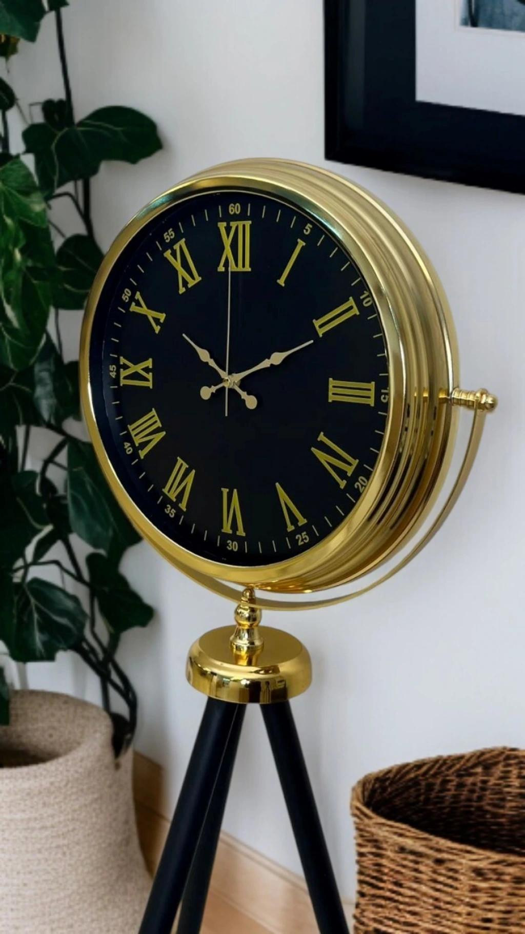 Metal gövdesinin gold kaplaması, siyah kadranla şık bir kontrast yaratırken; Roma rakamlar saate klasik ve asil bir karakter kazandırır. Tripod ayak yapısı hem estetik hem de sağlam bir duruş sağlar. Ürün, sadece bir saat değil aynı zamanda mekânın havasını yükselten dekoratif bir obje olarak tasarlanmıştır.