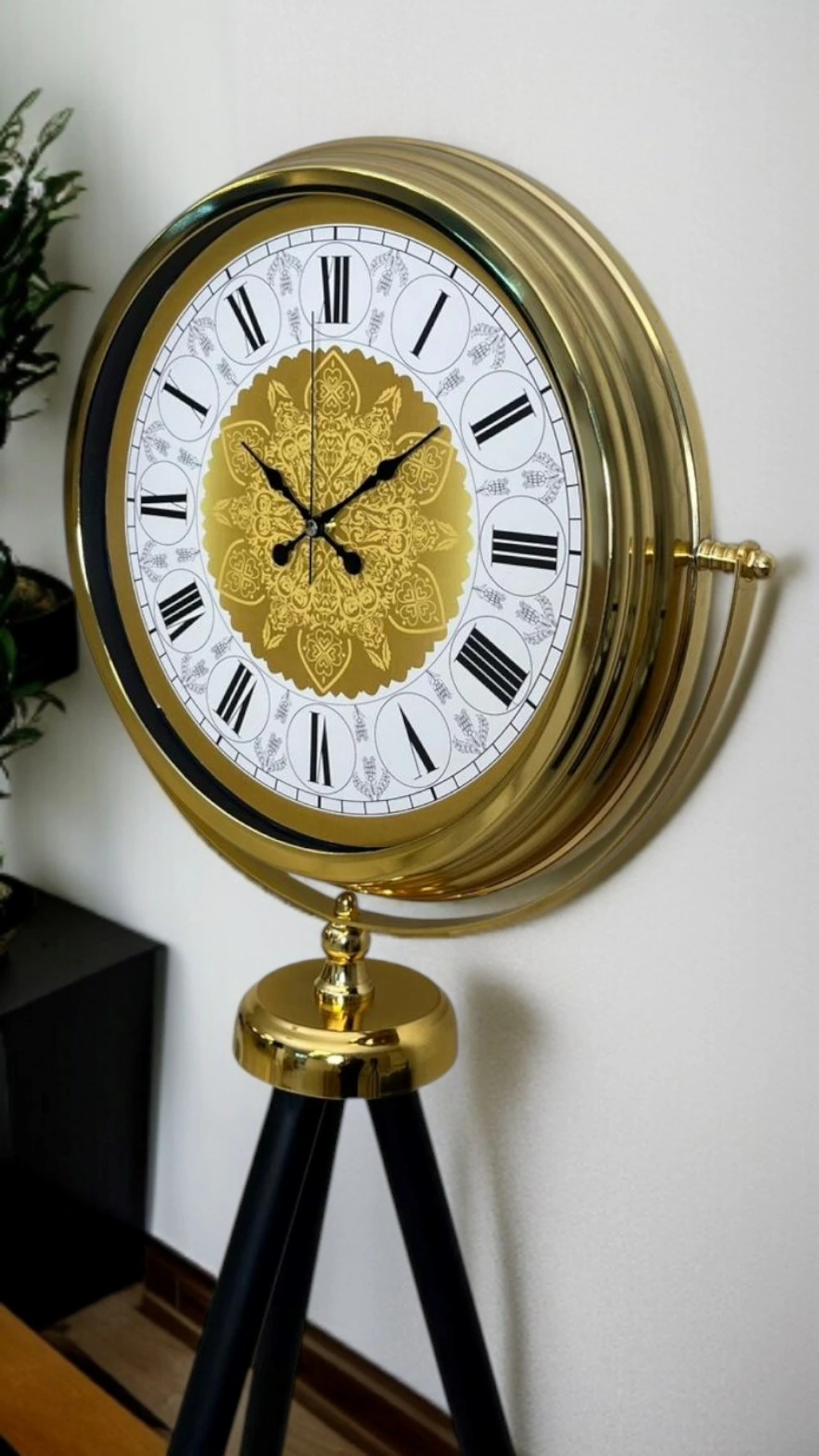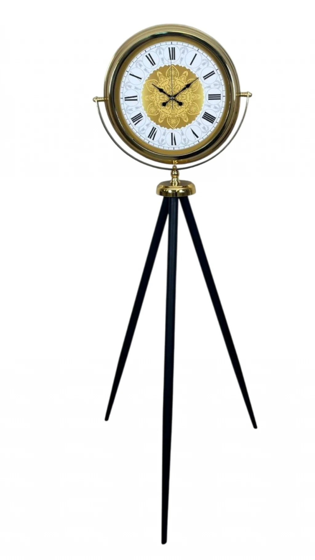 Sanatsal detayları ve zarif duruşuyla öne çıkan bu gold tripod ayaklı yer saati, klasik estetiği modern çizgilerle birleştirerek yaşam alanlarına güçlü bir karakter kazandırır. Saat kadranının merkezinde yer alan altın motifli desen, ürüne dekoratif bir derinlik ve sofistike bir görünüm sunar. Roma rakamlı göstergeler, klasik saat anlayışını yansıtırken; gold çerçeve ile bütünleşerek zamansız bir şıklık oluşturur.