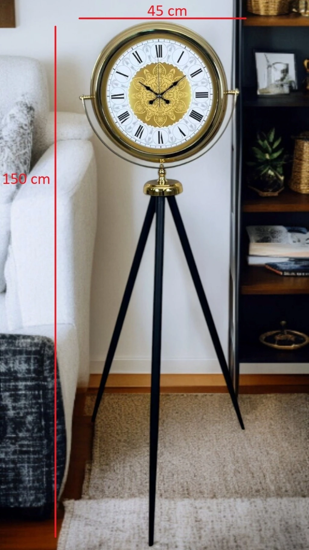 Siyah metal tripod ayakları sayesinde saat, zeminde son derece dengeli durur. Duvar montajına gerek kalmadan kullanılabilir ve istenilen alana kolayca taşınabilir. Yüksekliği sayesinde bulunduğu ortamda dekoratif bir odak noktası oluşturur. Sessiz ve akıcı çalışan mekanizması ile tik-tak sesi yapmaz; bu sayede salon, ofis, çalışma alanı veya otel lobileri gibi sessizliğin önemli olduğu mekânlar için idealdir.