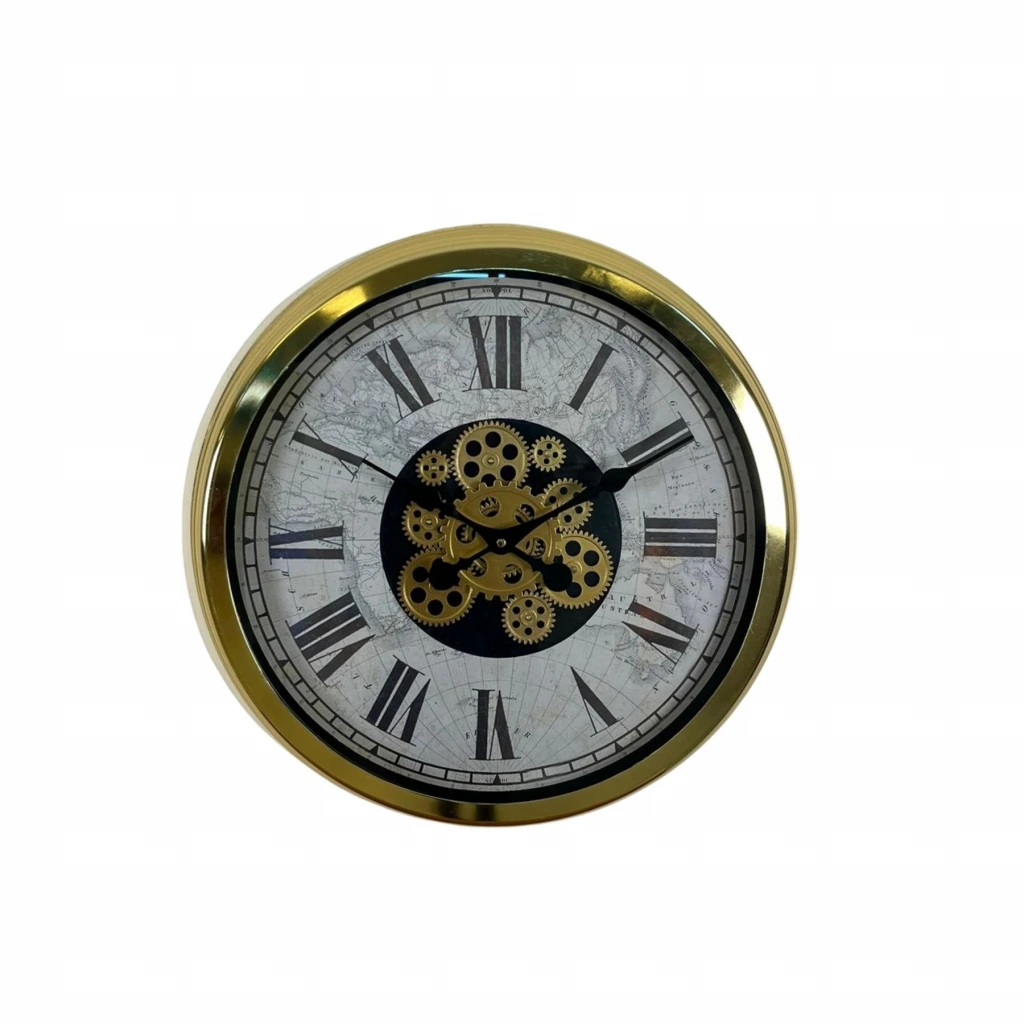Klasik Roma rakamları, dünya haritası zemin tasarımı ve gold çerçevesi ile öne çıkan 60 cm Gold Atlas Çarklı Duvar Saati; zamansız şıklığı ve mekanik estetiği bir araya getirir.