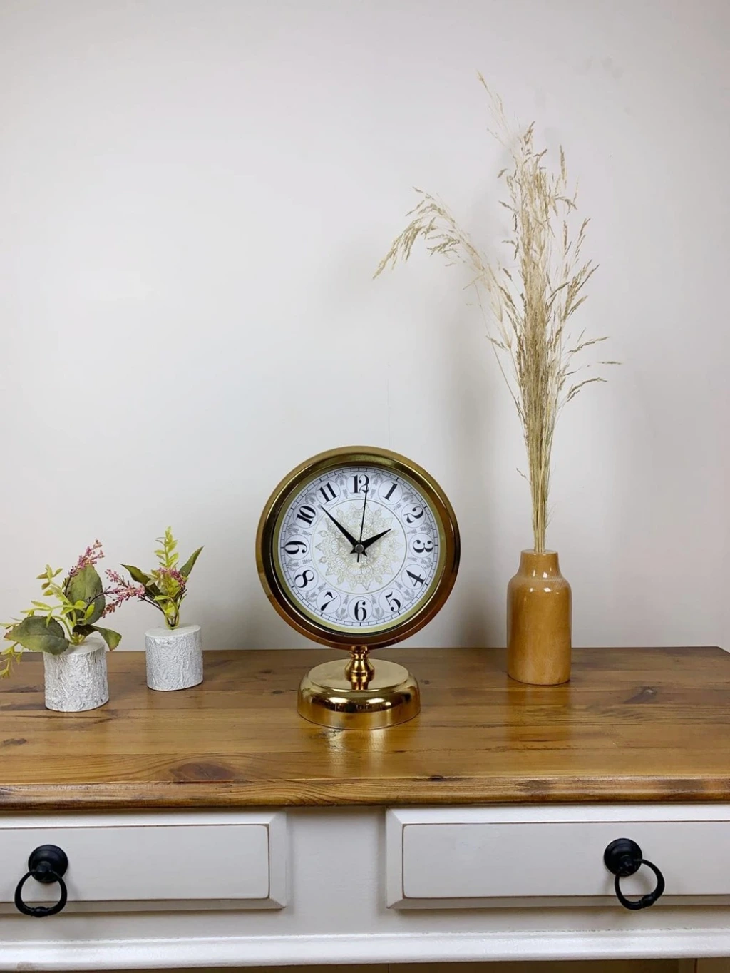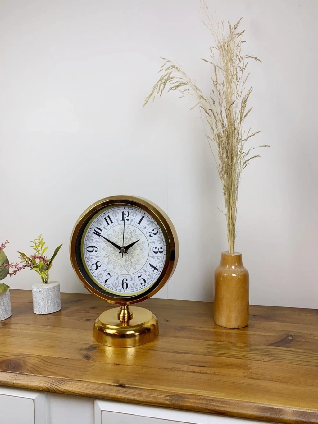 Şık ve modern tasarımıyla dikkat çeken  gold kaplama masa saatimiz, sessiz akar saniye mekanizmasıyla konforlu bir kullanım sunar. Gerçek cam koruma paneli sayesinde uzun ömürlü ve dayanıklıdır. Estetik görünümüyle hem ev hem de iş yerleri için ideal bir dekoratif üründür.