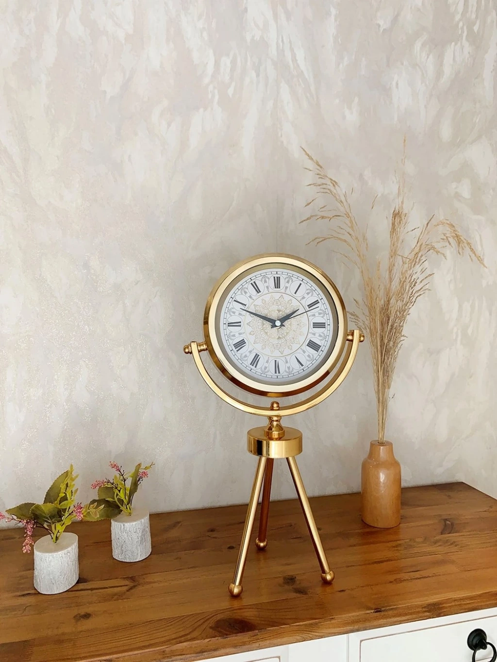 Şık ve modern tasarımıyla dikkat çeken gold kaplama mini tripod masa saatimiz, sessiz akar saniye mekanizmasıyla konforlu bir kullanım sunar. Gerçek cam koruma paneli sayesinde uzun ömürlü ve dayanıklıdır. Estetik görünümüyle hem ev hem de iş yerleri için ideal bir dekoratif üründür.