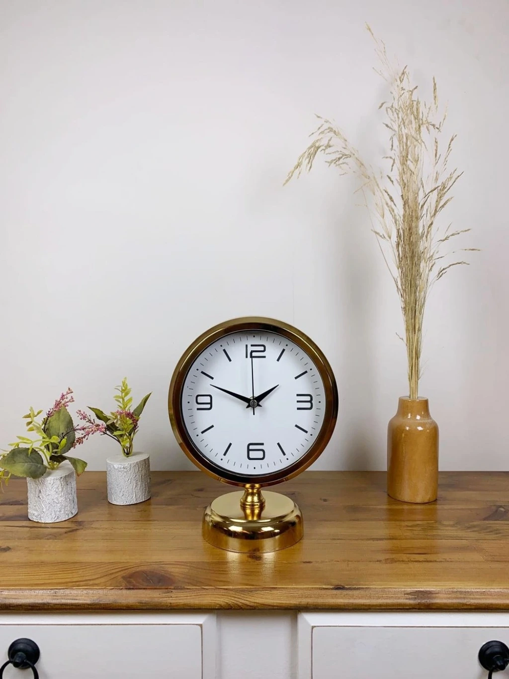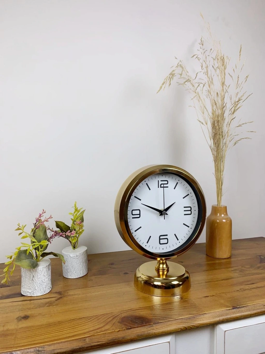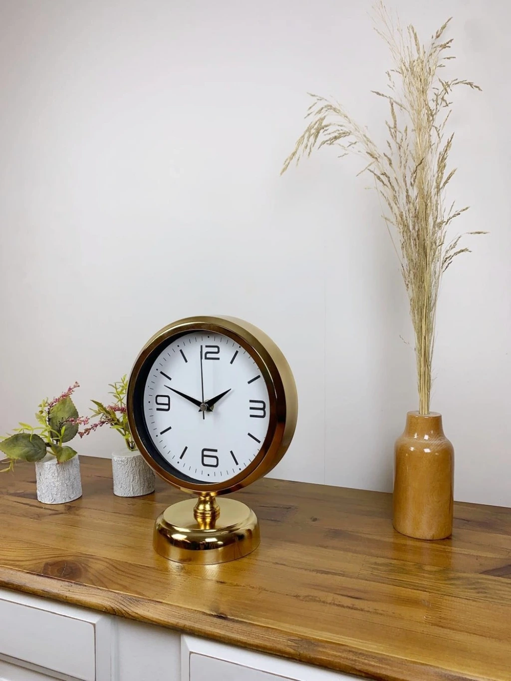 Şık ve modern tasarımıyla dikkat çeken  gold kaplama masa saatimiz, sessiz akar saniye mekanizmasıyla konforlu bir kullanım sunar. Gerçek cam koruma paneli sayesinde uzun ömürlü ve dayanıklıdır. Estetik görünümüyle hem ev hem de iş yerleri için ideal bir dekoratif üründür.