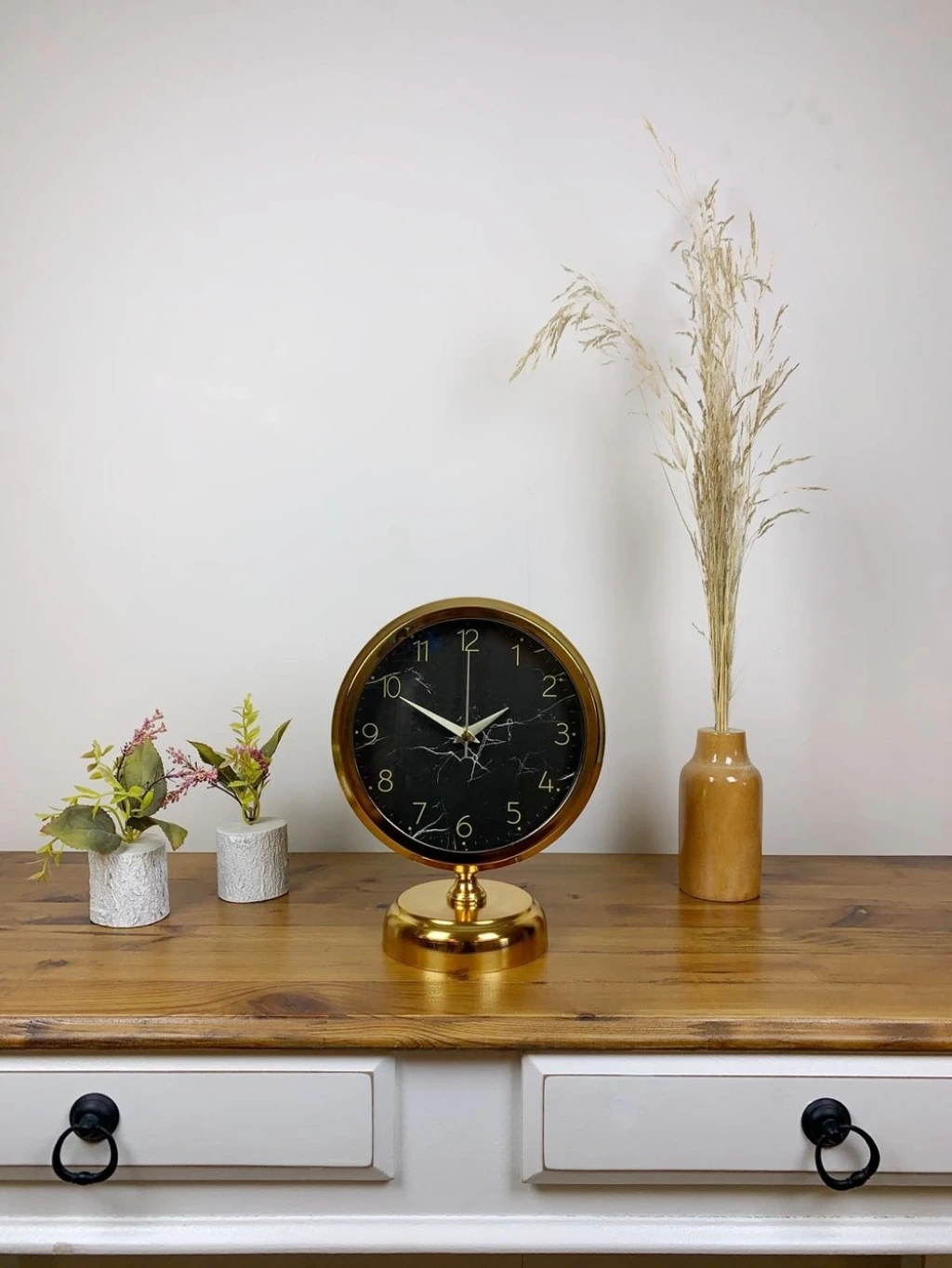 Şık ve modern tasarımıyla dikkat çeken  gold kaplama masa saatimiz, sessiz akar saniye mekanizmasıyla konforlu bir kullanım sunar. Gerçek cam koruma paneli sayesinde uzun ömürlü ve dayanıklıdır. Estetik görünümüyle hem ev hem de iş yerleri için ideal bir dekoratif üründür.