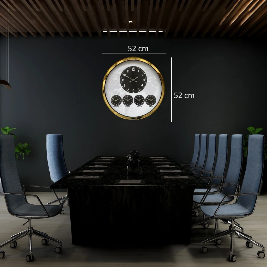 Modern dünya haritası tasarımı ve parlak gold çerçevesi ile bu 52 cm duvar saati; ofisler, yönetim odaları ve prestijli yaşam alanları için güçlü bir dekoratif tamamlayıcıdır.