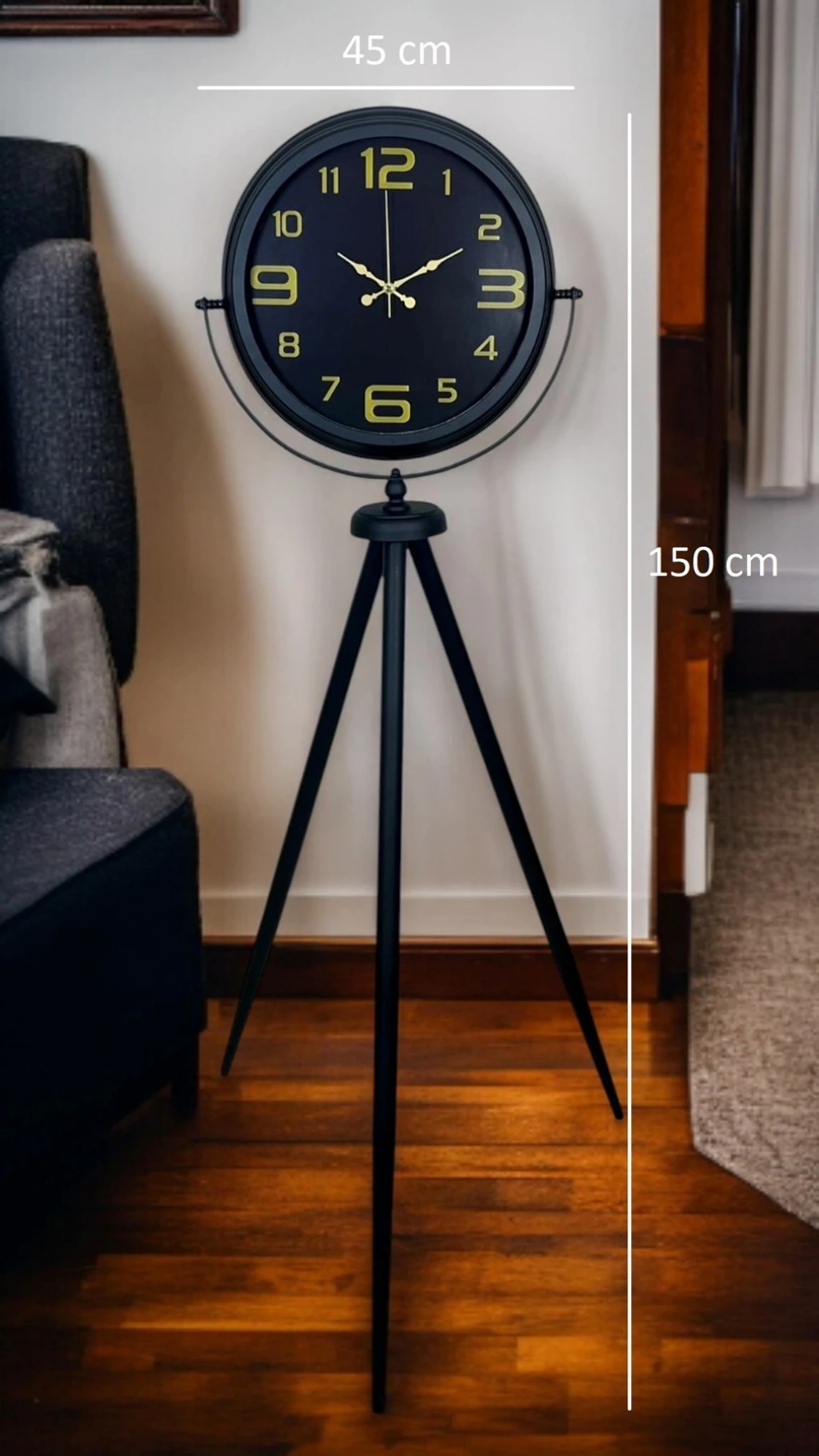 Yaşam alanınıza lüks bir dokunuş ve güçlü bir dekor etkisi kazandıran Siyah Tripod Ayaklı Dekoratif Salon Saati, 150 x 45 cm ölçüsüyle salon, ofis ve geniş mekanlarda dikkatleri üzerine çeker. Siyah metal tripod ayak tasarımı, modern ve endüstriyel çizgileri sevenler için şık bir tamamlayıcı olurken; siyah kadran üzerindeki gold rakamlar ve gold ibreler ürüne premium bir görünüm kazandırır. Bu özel kombinasyon, saati sadece işlevsel bir ürün olmaktan çıkarıp dekorun yıldızı haline getirir.