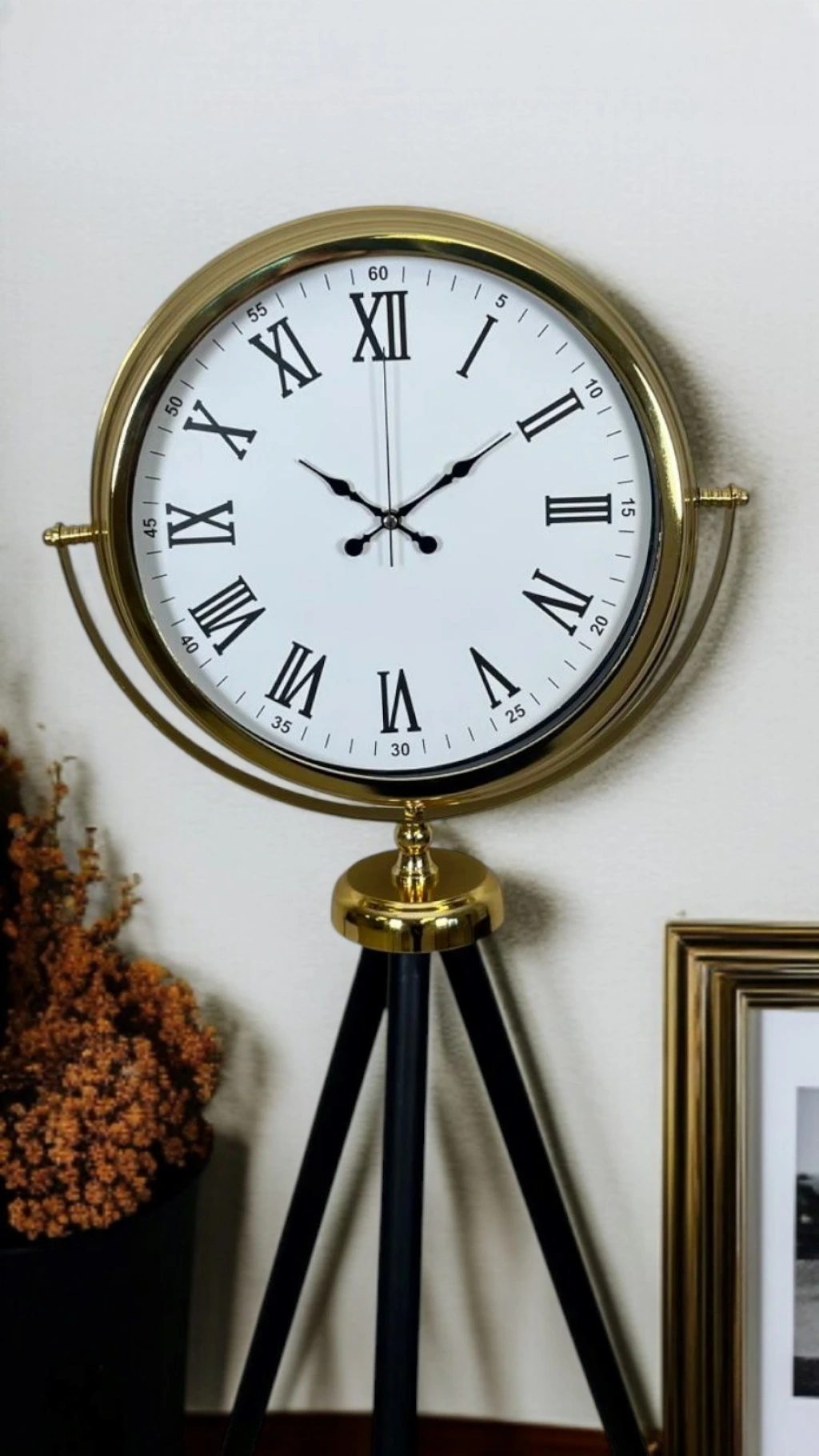 Zamansız tasarımı, klasik Roma rakamları ve modern tripod ayak formuyla öne çıkan bu gold ayaklı saat, yaşam alanlarınıza güçlü bir karakter ve sofistike bir duruş kazandırır. Beyaz kadranı üzerinde yer alan Roma rakamları, saat tasarımına asil ve klasik bir hava katarken; parlak gold metal çerçevesi mekânda lüks bir odak noktası oluşturur.