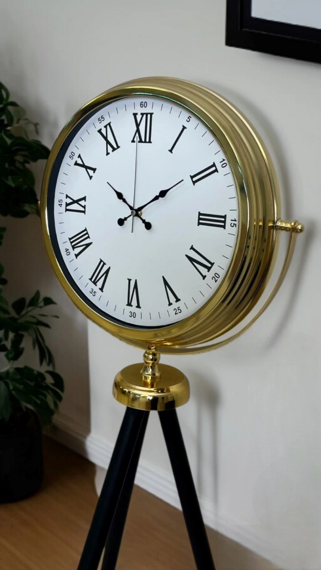150 cm yüksekliği sayesinde yalnızca bir saat değil, aynı zamanda dekoratif bir obje olarak da kullanılır. Salon, ofis, lobi, otel, restoran ve vitrin gibi geniş alanlarda etkileyici bir görünüm sunar. Siyah tripod ayakları, gold gövde ile mükemmel bir kontrast oluşturarak modern ve dengeli bir tasarım ortaya koyar.