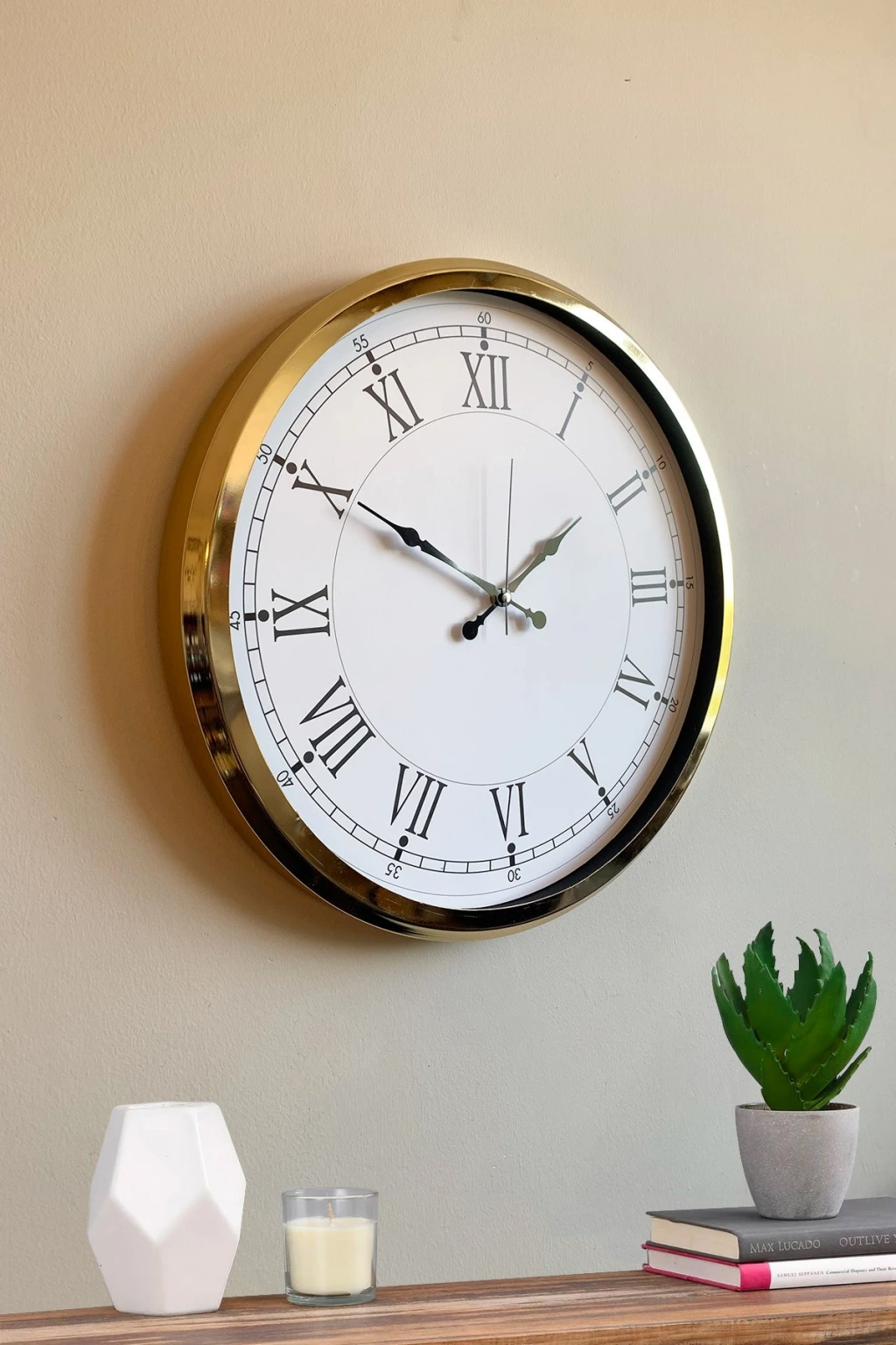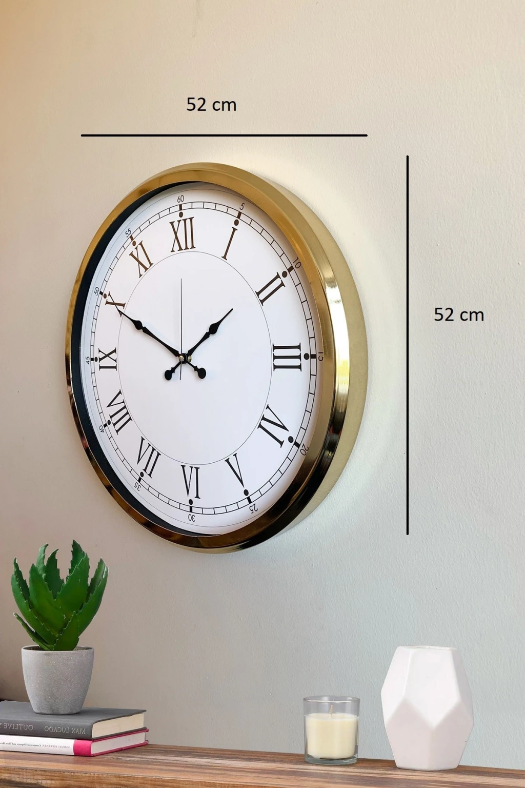 Geniş ölçüsü ve göz alıcı gold çerçevesiyle öne çıkan bu 52 x 52 cm büyük duvar saati, modern ve şık tasarımıyla ev ve iş yerlerine zarif bir dokunuş katar. Ön yüzeyinde yer alan gerçek cam kaplama, saatin hem daha parlak hem de daha dayanıklı olmasını sağlar. Sessiz çalışan mekanizması ile tik-tak sesi olmadan huzurlu bir ortam sunar. Büyük kadranı ve net rakamları sayesinde uzaktan bile rahatlıkla okunabilir. Salon, ofis, mutfak, çalışma odası, kafe ve geniş alanlar için ideal bir dekoratif üründür.