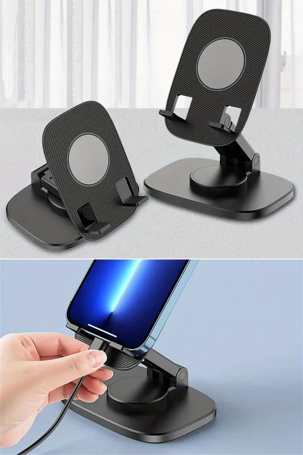 360° Döner Masaüstü Mobil Telefon Tutucu Standı, telefonunuzu en rahat açıdan izleyebilmeniz için tasarlanmış, pratik ve çok yönlü bir aksesuardır. İster video görüşme yapın, ister film izleyin ya da cihazınızı şarj edin – bu stand her açıdan kullanım kolaylığı sağlar. Şık ve ergonomik tasarımı sayesinde hem evde hem de ofiste kullanım için idealdir.