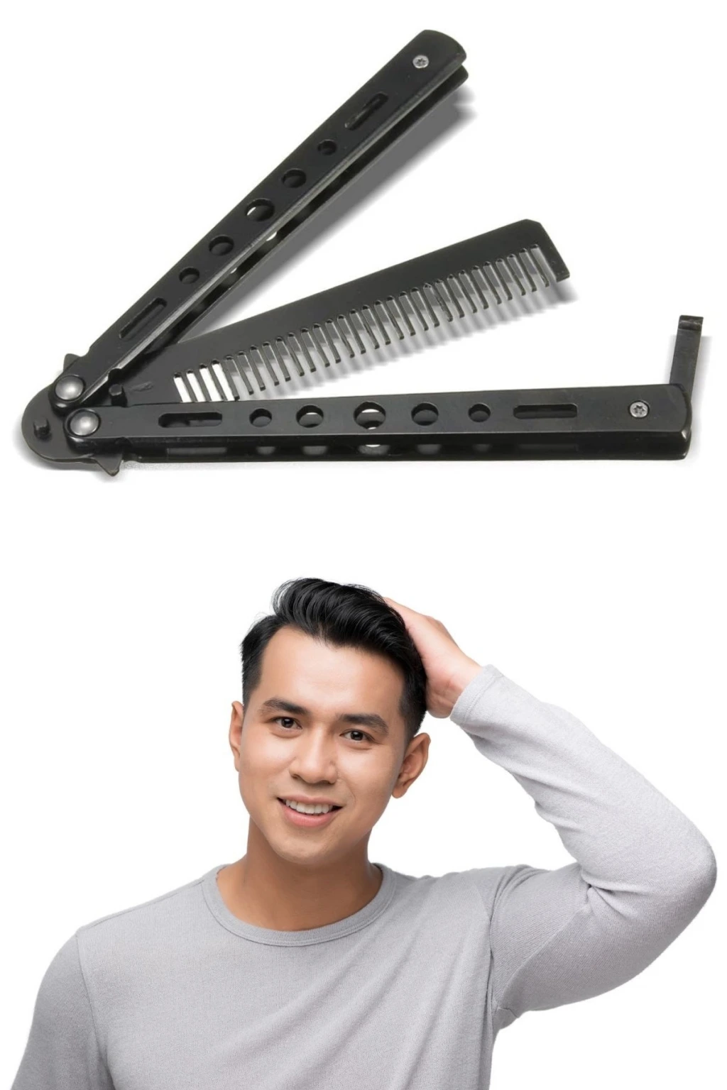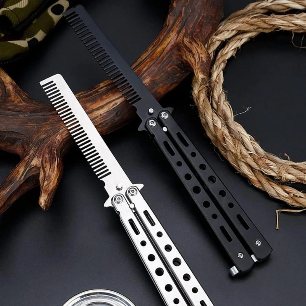 İpek Yıldızı® Siyah Katlanabilir Paslanmaz Çelik Kelebek Bıçak Tarak – Sakal & Bıyık Fırçası, Profesyonel Saç Kesimi İçin Tarak