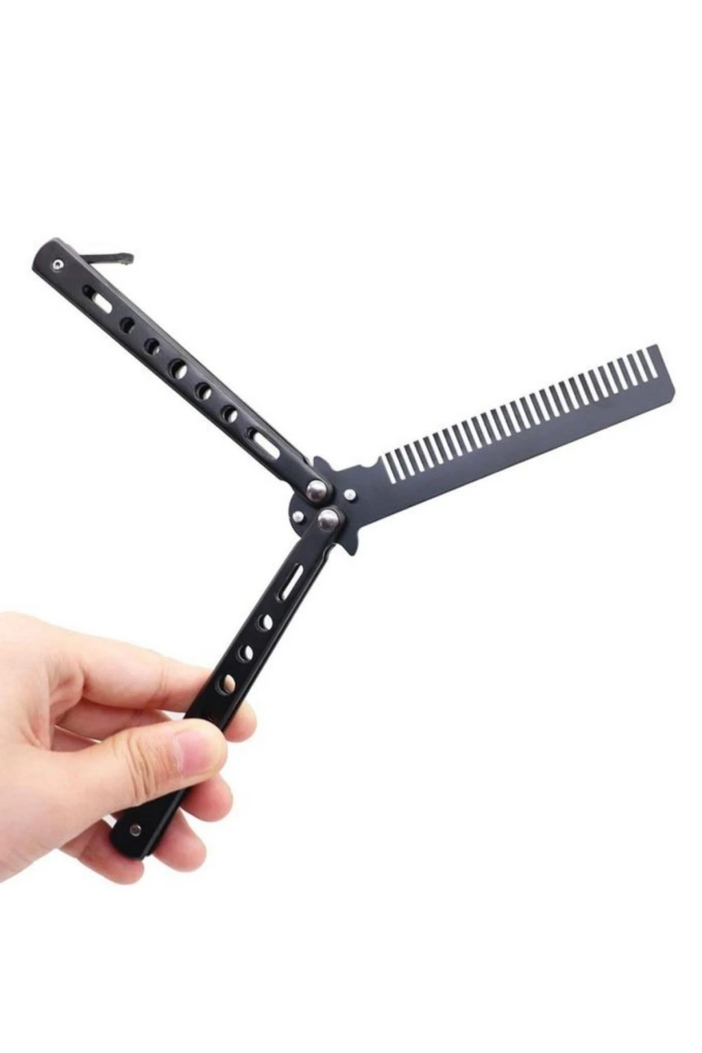 İpek Yıldızı® Siyah Katlanabilir Paslanmaz Çelik Kelebek Bıçak Tarak, hem profesyonel berberler hem de kişisel bakımına özen gösterenler için özel olarak tasarlanmıştır. Şık ve ergonomik yapısıyla kolay kullanım sunan bu tarak, saç, sakal ve bıyık bakımını zahmetsiz hale getirir.