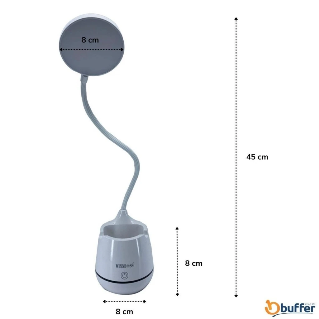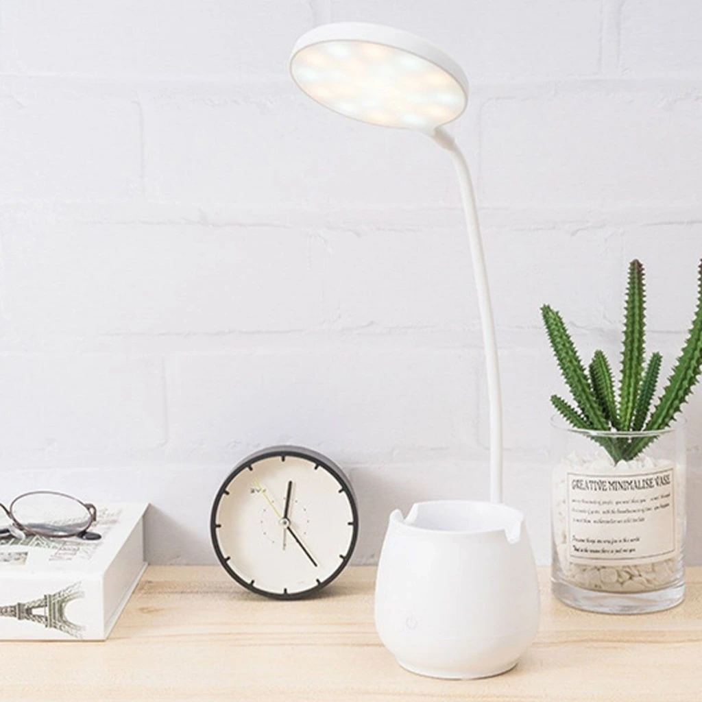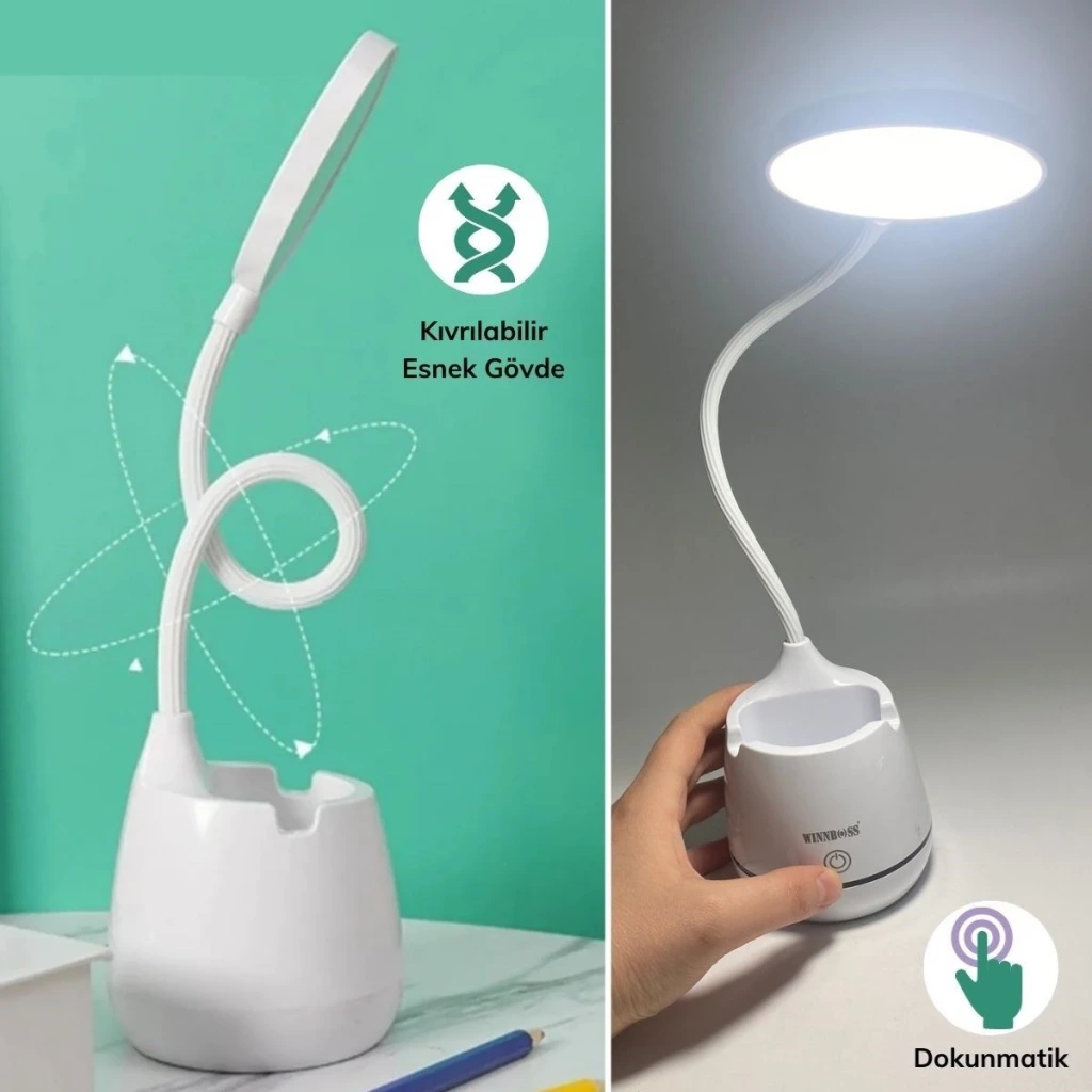 İpek Yıldızı® Kalemlikli ve Telefon Tutacaklı Şarjlı Dokunmatik 3 Farklı Modla Yanan Esnek Başlıklı Dimmerli LED Masa Lambası
