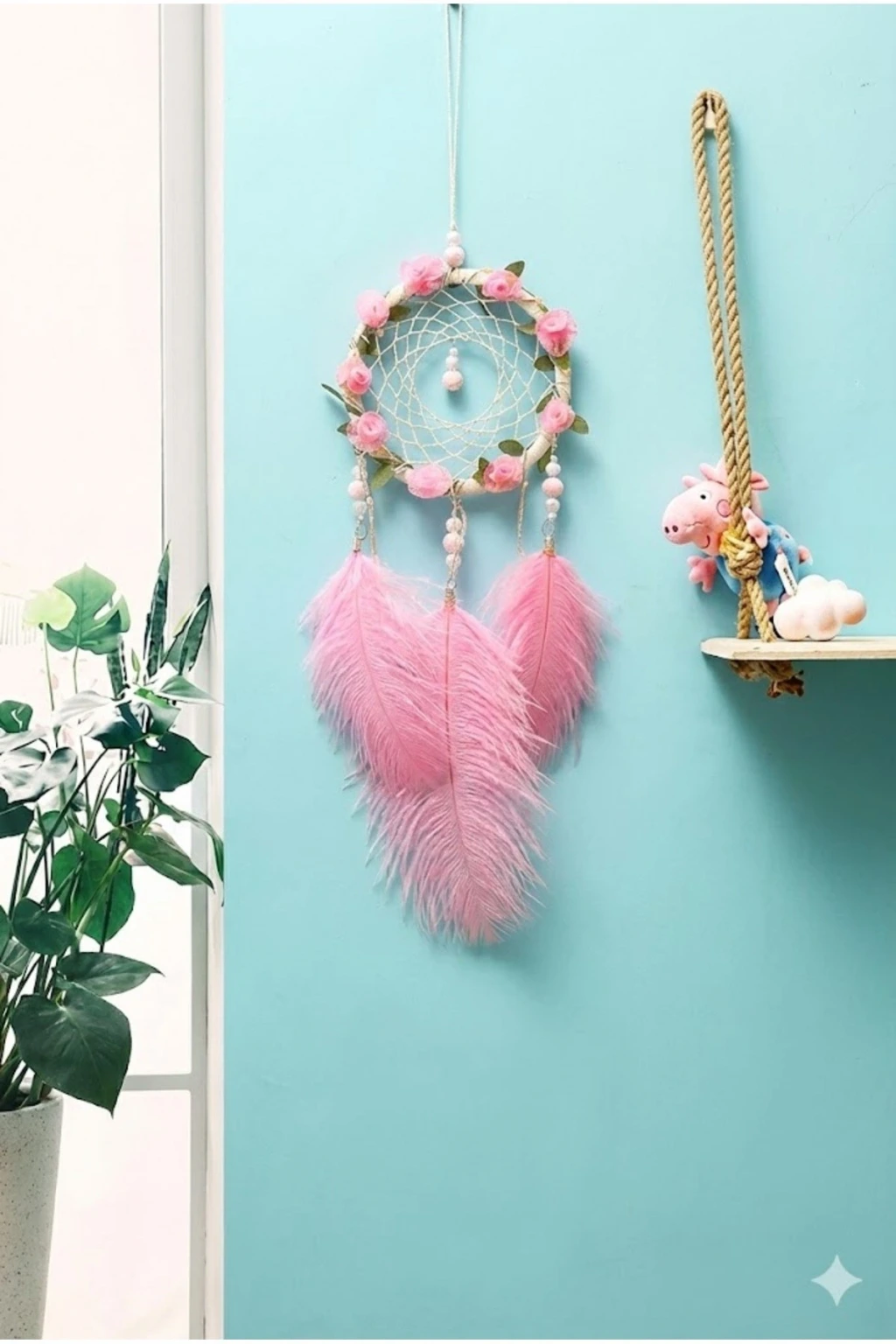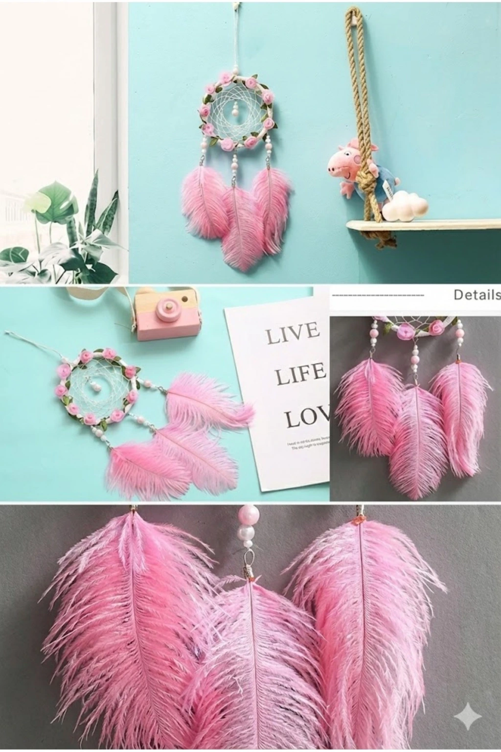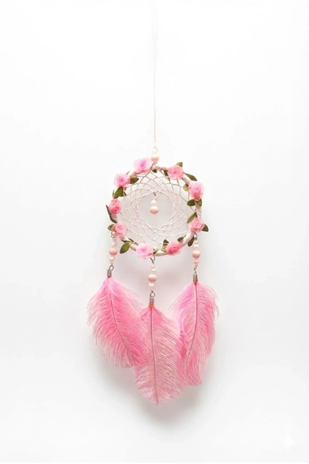 Işıklı Pembe Gül Detaylı El Yapımı Rüya Kapanı - Romantik Duvar Süsü & Hediyelik Düş Kapanı