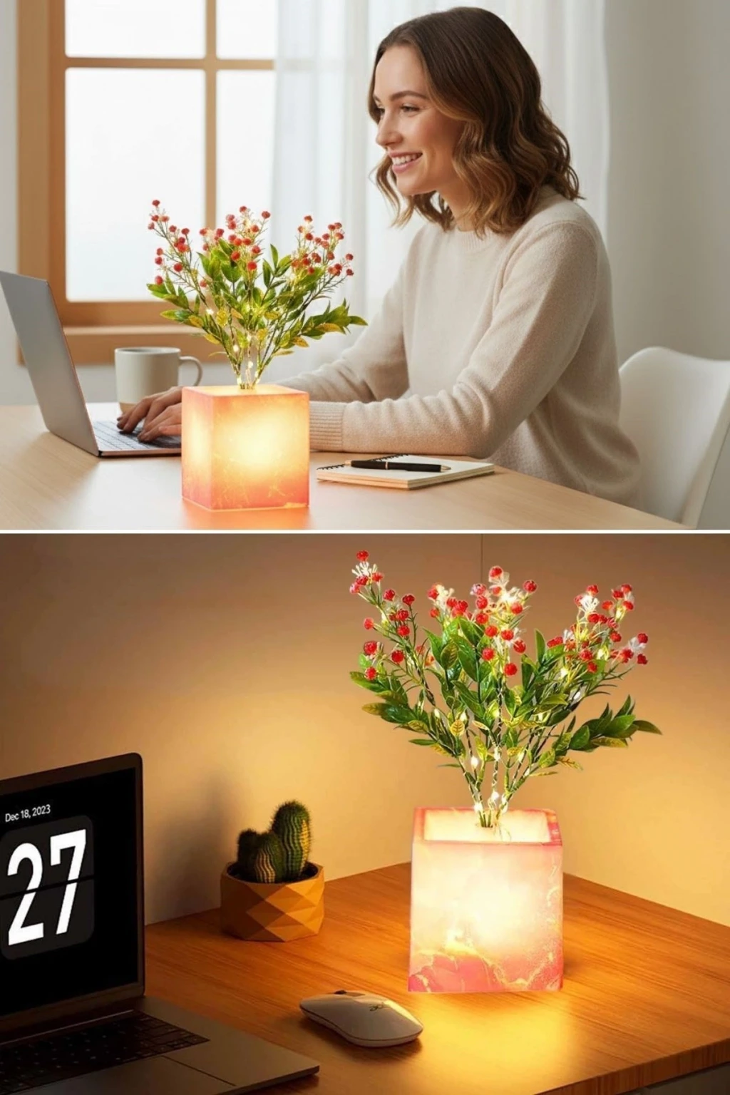 Işıklı Yapay Çiçek – Pembe Saksılı LED Dekoratif Bitki, Masaüstü ve Ev Ofis Aydınlatmalı Süs Bitkisi