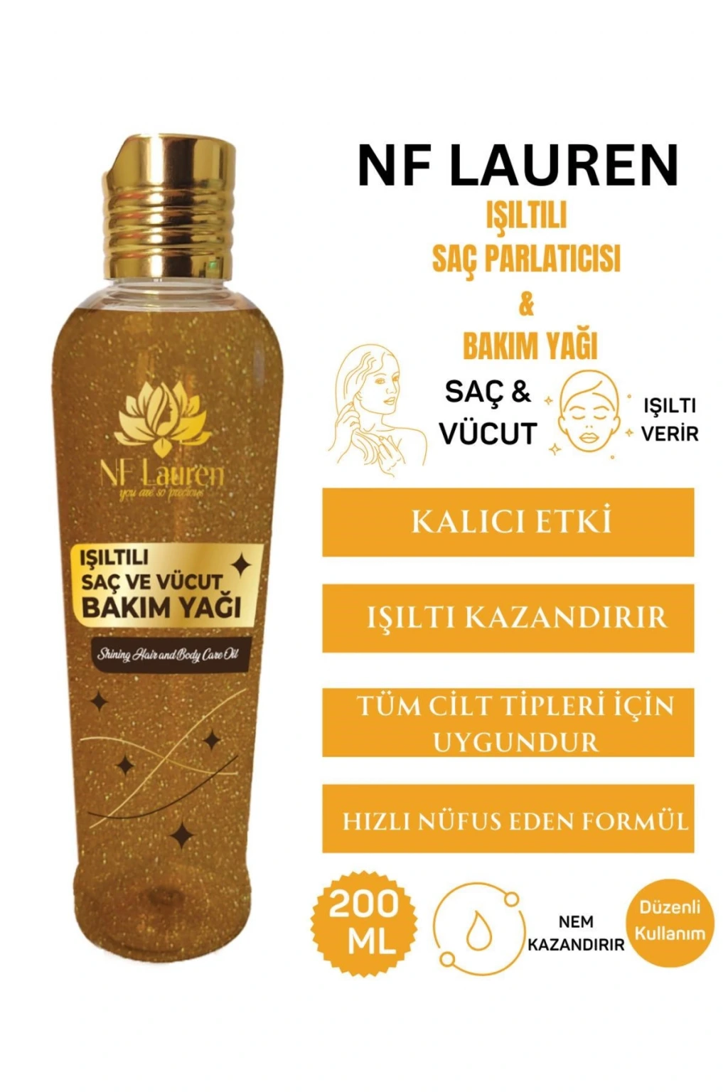 Işıltılı Saç ve vücut Bakım yağı Shınıng haır and body care oıl Nf lauren ışıltılı saç ve vücut yağı, hem Saçınıza hem de vücudunuza nem Kazandırmaya yardımcı olmak için formüle edilmiş Çok amaçlı ışıltılı bir yağ karışımıdır. ; Hafif ancak hızlı Nüfuz eden formülü sayesinde tüm cilt tipleri için Uygundur. ; Içindekier/ıngredients: Paraffinum liquidum, cocos nucifera oil, theobroma Cacao seed butter, parfum, silica, styrene/ısoprene Copolymer, aluminum stearate, tocopherol, synthetic Fluorphlogopite, zea mays germ oil, triticum vulgare Germ oil, chamomilla recutita flower extract, Caprylic/capric triglyceride, calendula officinalis Flower extract, macadamia ternifolia seed oil, Simmondsia chinensis seed oil. ; Kullanım şekli/use: Kullanmadan önce iyice çalkalayın. ; Nemli veya kuru Saça ve saç diplerine hafif masaj yaparak uygulanır. ; Saçta en az 30 dakika bekletiniz sonra durulayınız. ; Temizlenmiş cilde, bir miktar vücut yağını dairesel Hareketlerle masaj yaparak Uygulayınız. ; Uyarılar/warnings: Harici kullanım içindir. ; Göz çevresine Uygulamayınız. ; Göz ile temasından sakınınız. ; Göze teması durumunda bol su ile yıkayınız. ; Çocukların ulaşamayacağı yerde saklayınız. ; Kuru ve serin yerde muhafaza ediniz. ; Yutulması Durumunda doktora Başvurunuz.;