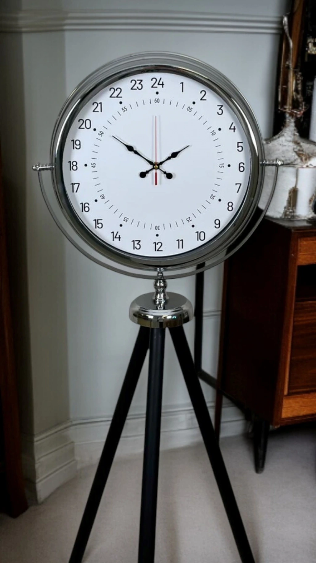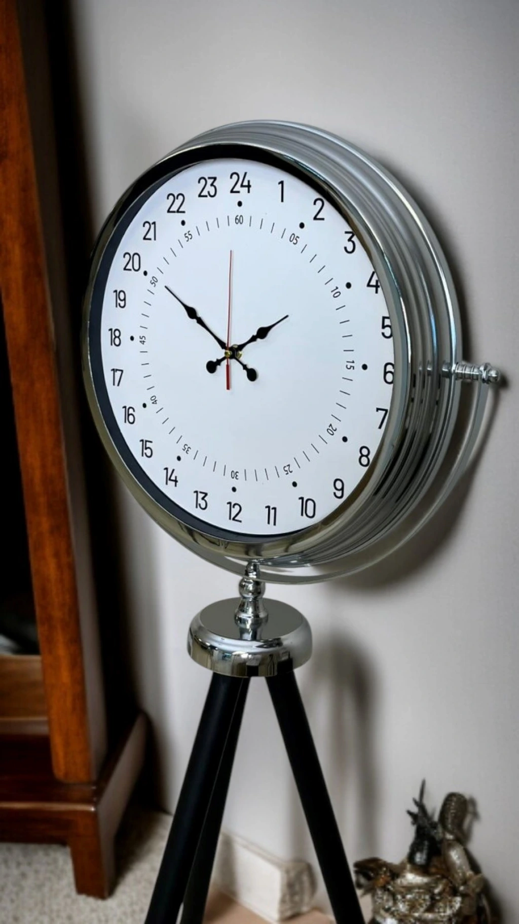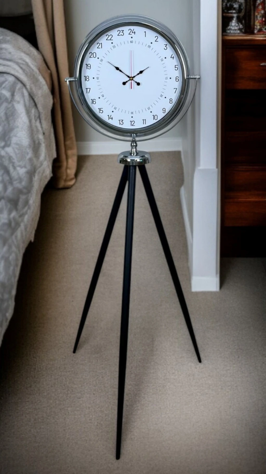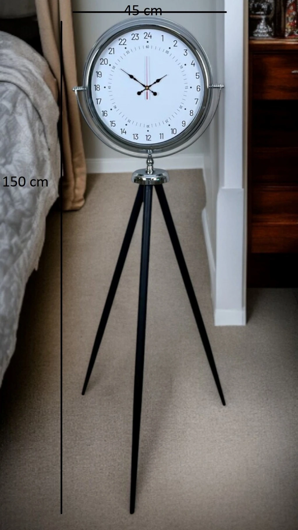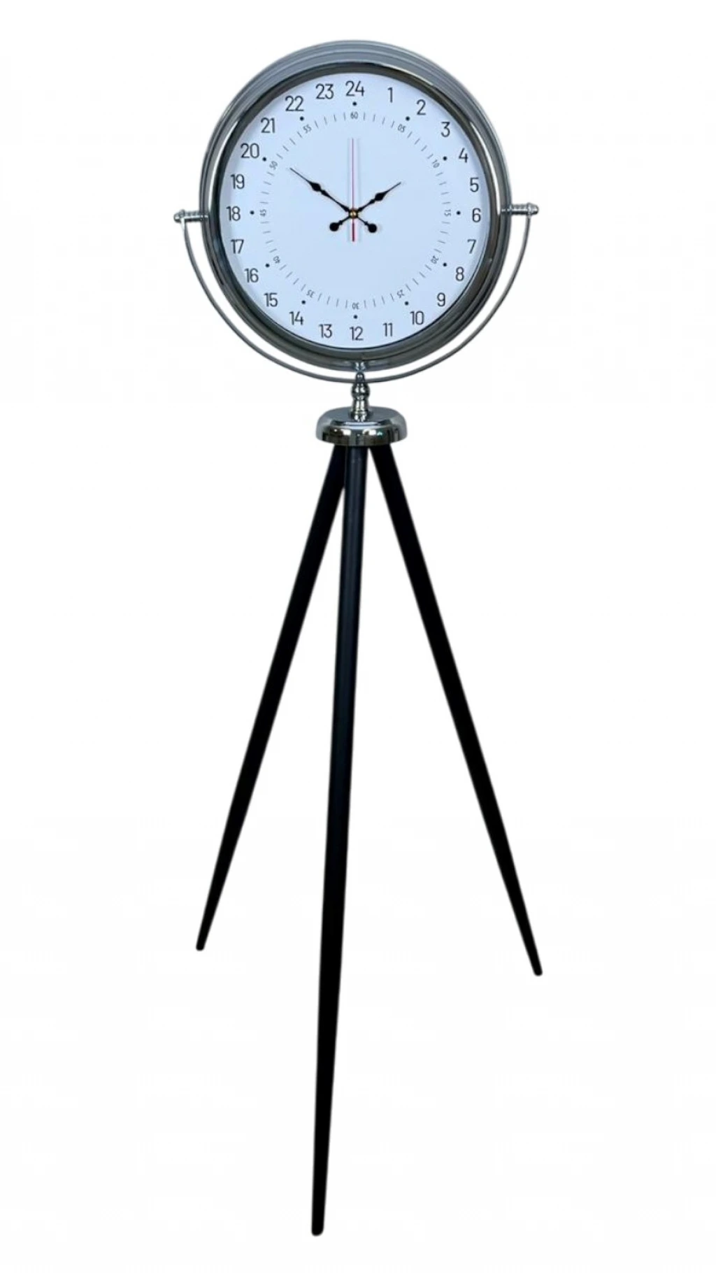 Standart saat anlayışının ötesine geçen bu krom tripod ayaklı yer saati, 24 saat göstergeli özel kadranı ile klasik saatlerden tamamen ayrılır. Zamanı yalnızca gösteren değil, zaman algısını değiştiren bu tasarım; hem fonksiyonel hem de dekoratif açıdan fark yaratmak isteyenler için özel olarak tasarlanmıştır.
