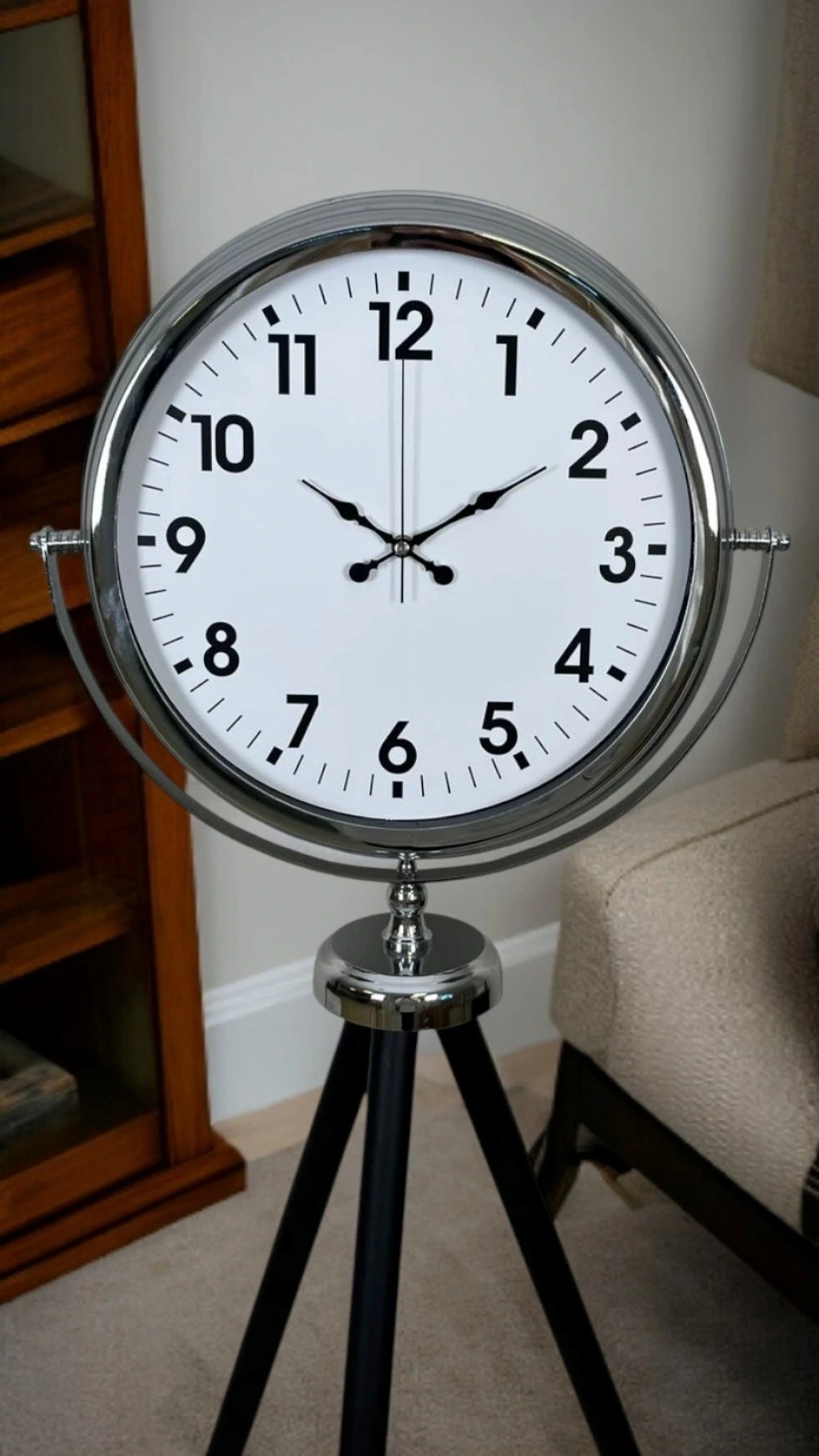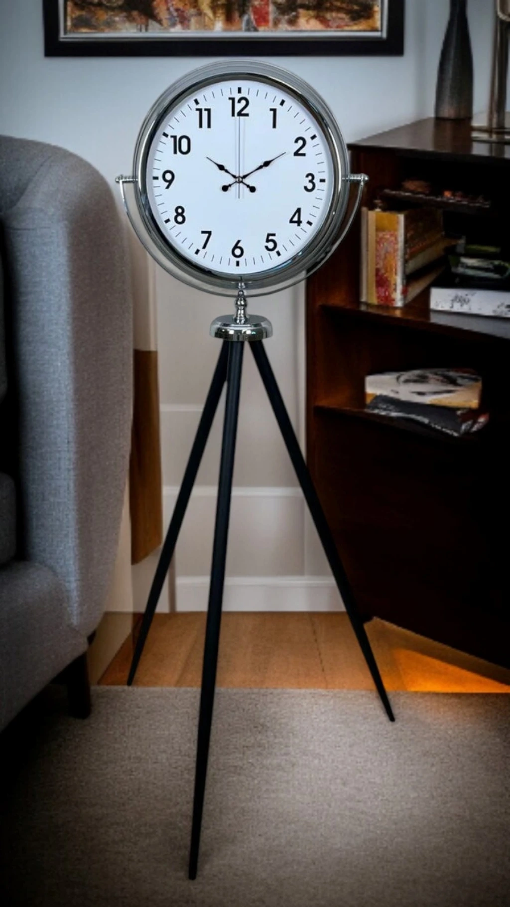 Bu tripod ayaklı saat, yalnızca zamanı göstermek için değil; mekâna stil, şıklık ve prestij katmak isteyenler için tasarlanmıştır. Modern, klasik ve endüstriyel dekorasyon stilleriyle rahatlıkla uyum sağlar.