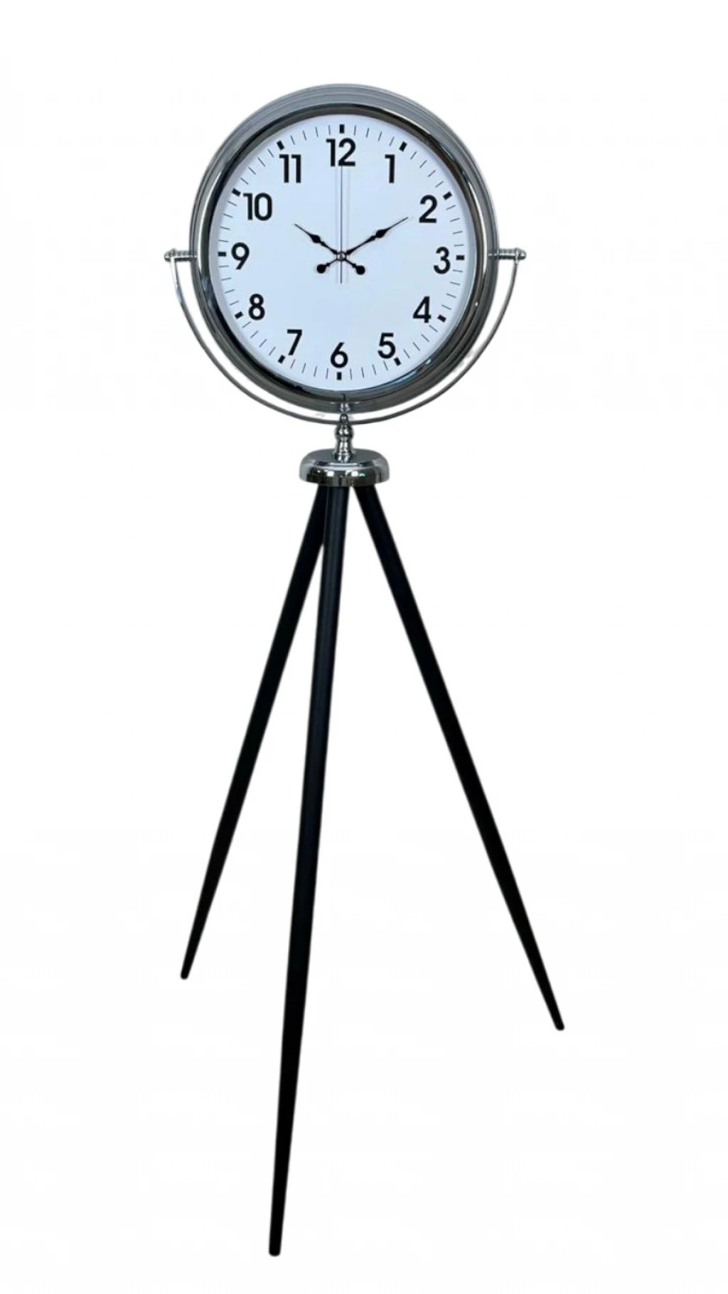 Parlak krom metal gövdesi, beyaz kadranı ve net rakam tasarımıyla hem modern hem de şık bir duruş sunar. Üç ayaklı tripod tasarımı, saate hem estetik hem de sağlam bir denge kazandırırken; salon, ofis, lobi, mağaza, otel ve showroom gibi geniş alanlar için ideal bir dekoratif tamamlayıcıdır.