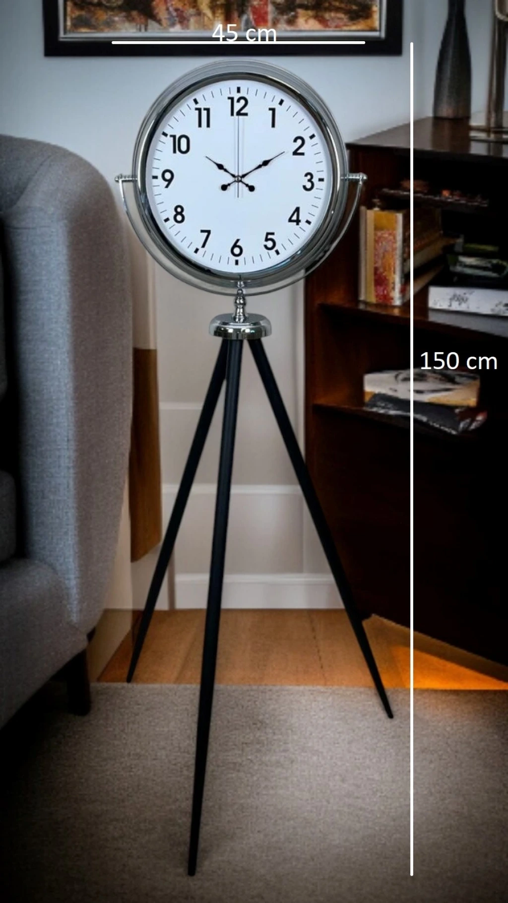 Modern çizgilerle zamansız tasarımı bir araya getiren bu krom tripod ayaklı saat, klasik saat anlayışının çok ötesinde, mekânlara güçlü bir karakter kazandırmak için tasarlanmıştır. 150 cm yüksekliği ve 45 cm genişliğiyle bulunduğu ortamda dikkat çeken bir odak noktası oluşturur. Sıradan duvar saatlerinden farklı olarak ayaklı yapısı sayesinde dekorasyonun bir parçası değil, başrolü olur.