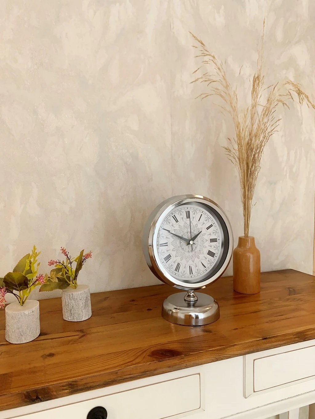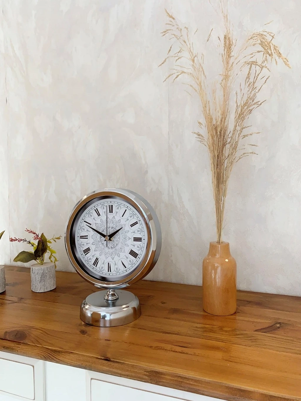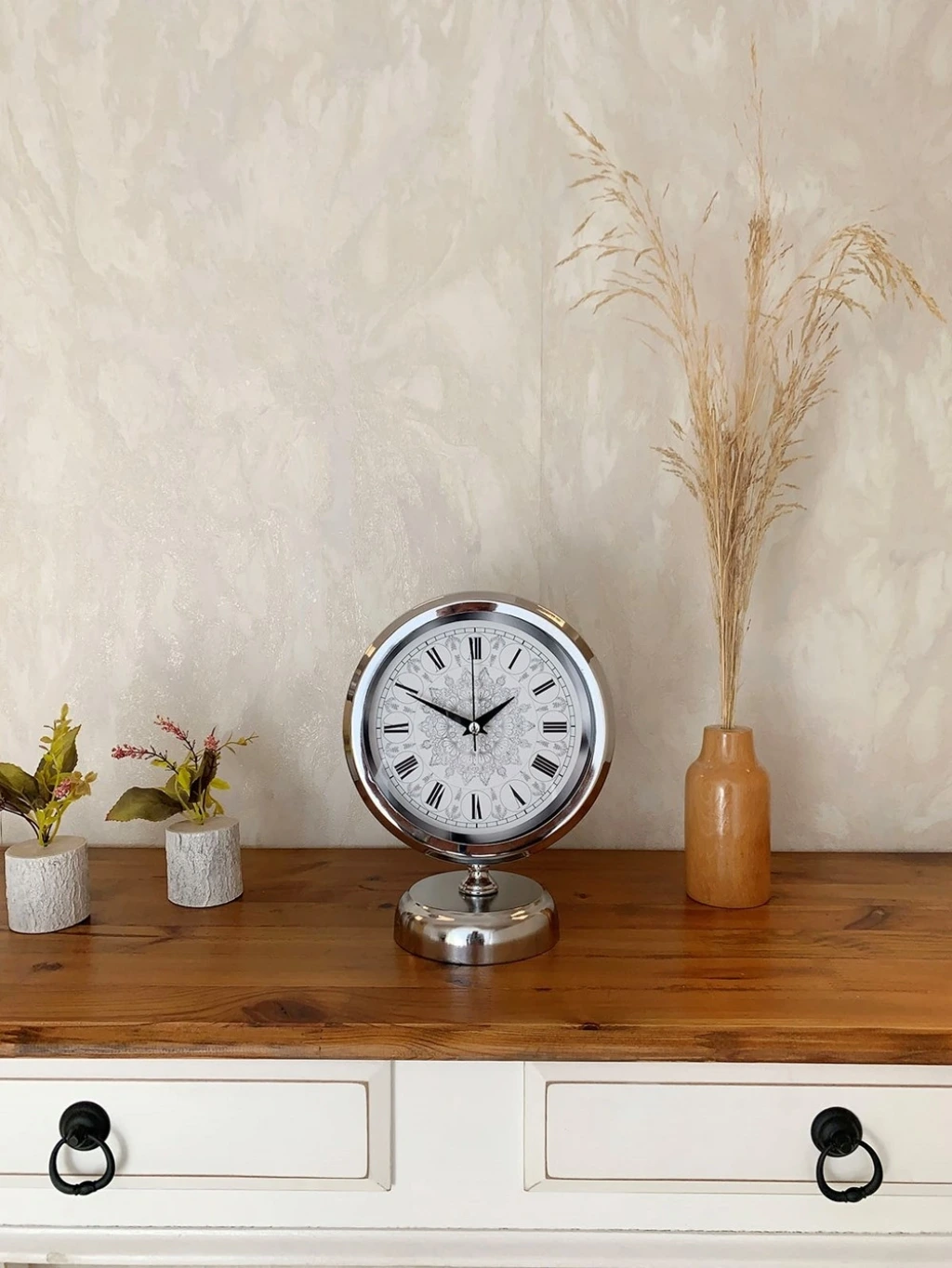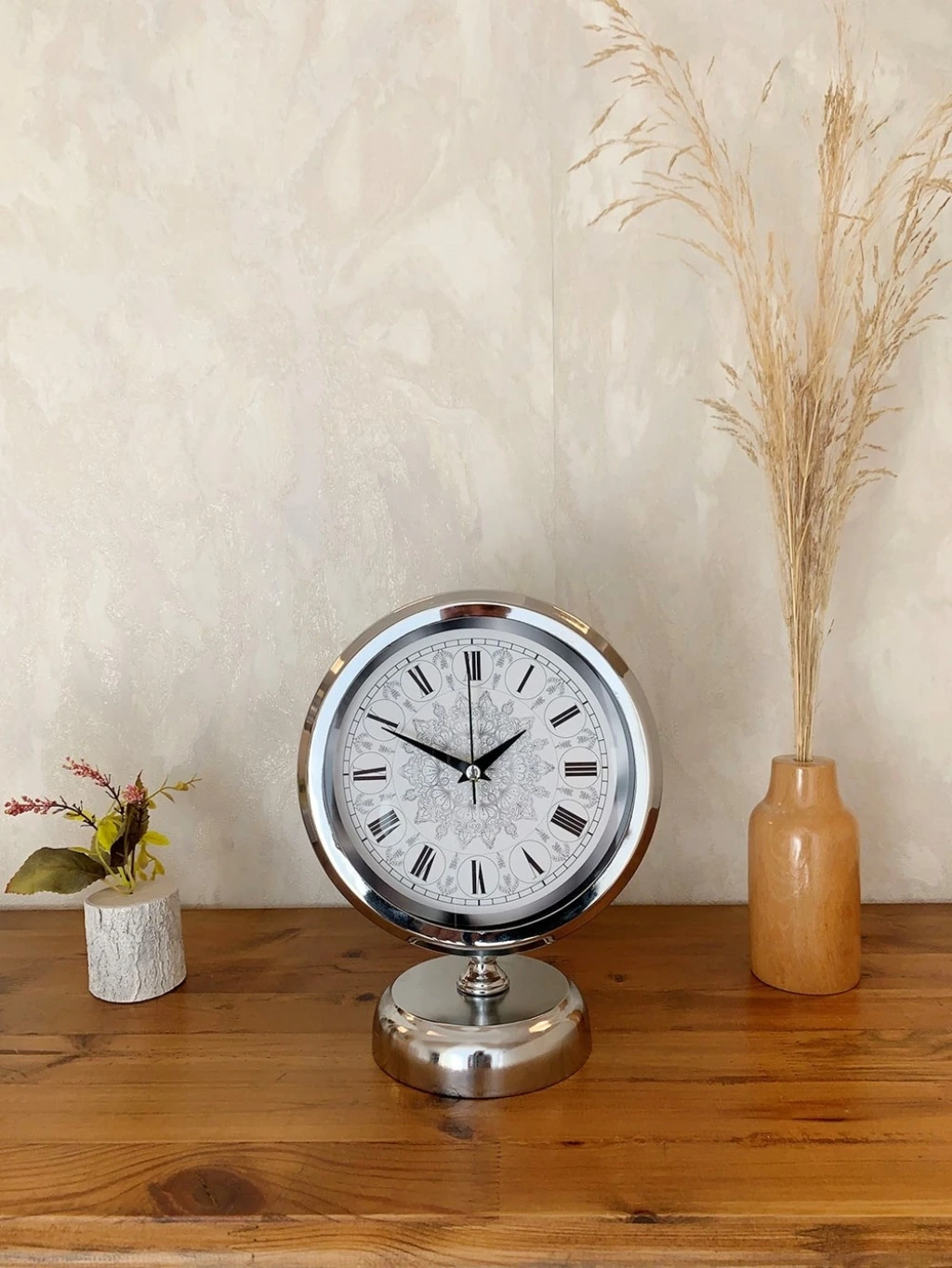 Krom Metal Çini Desen Roma Rakamlı Masa Saati